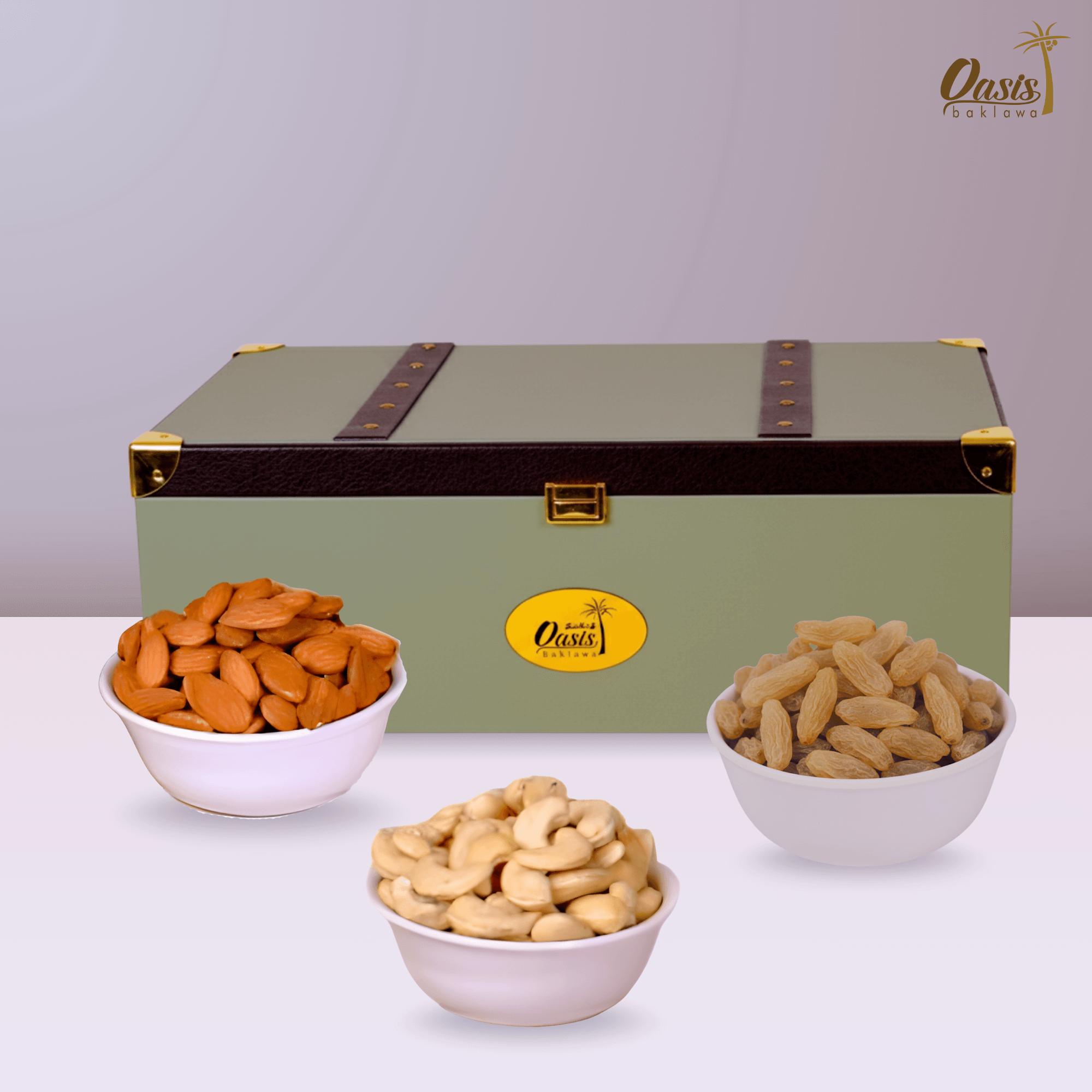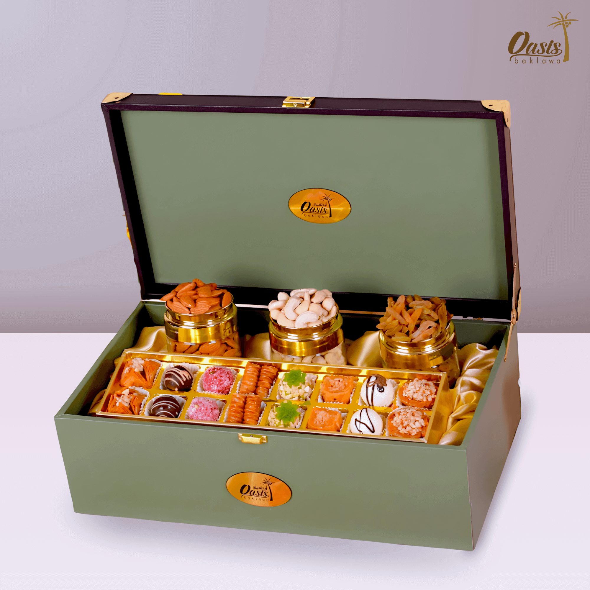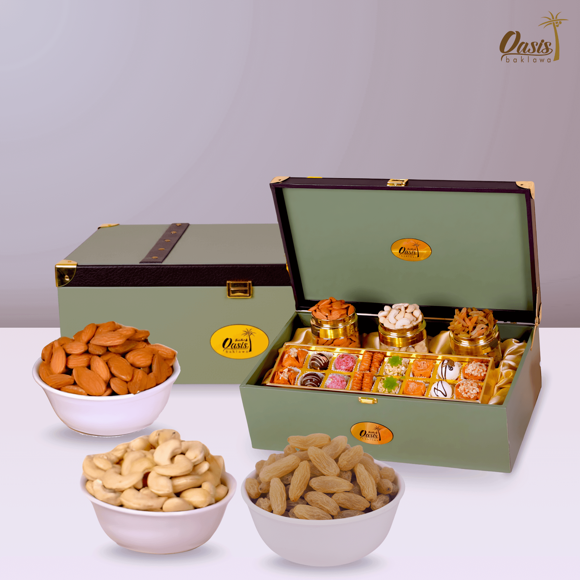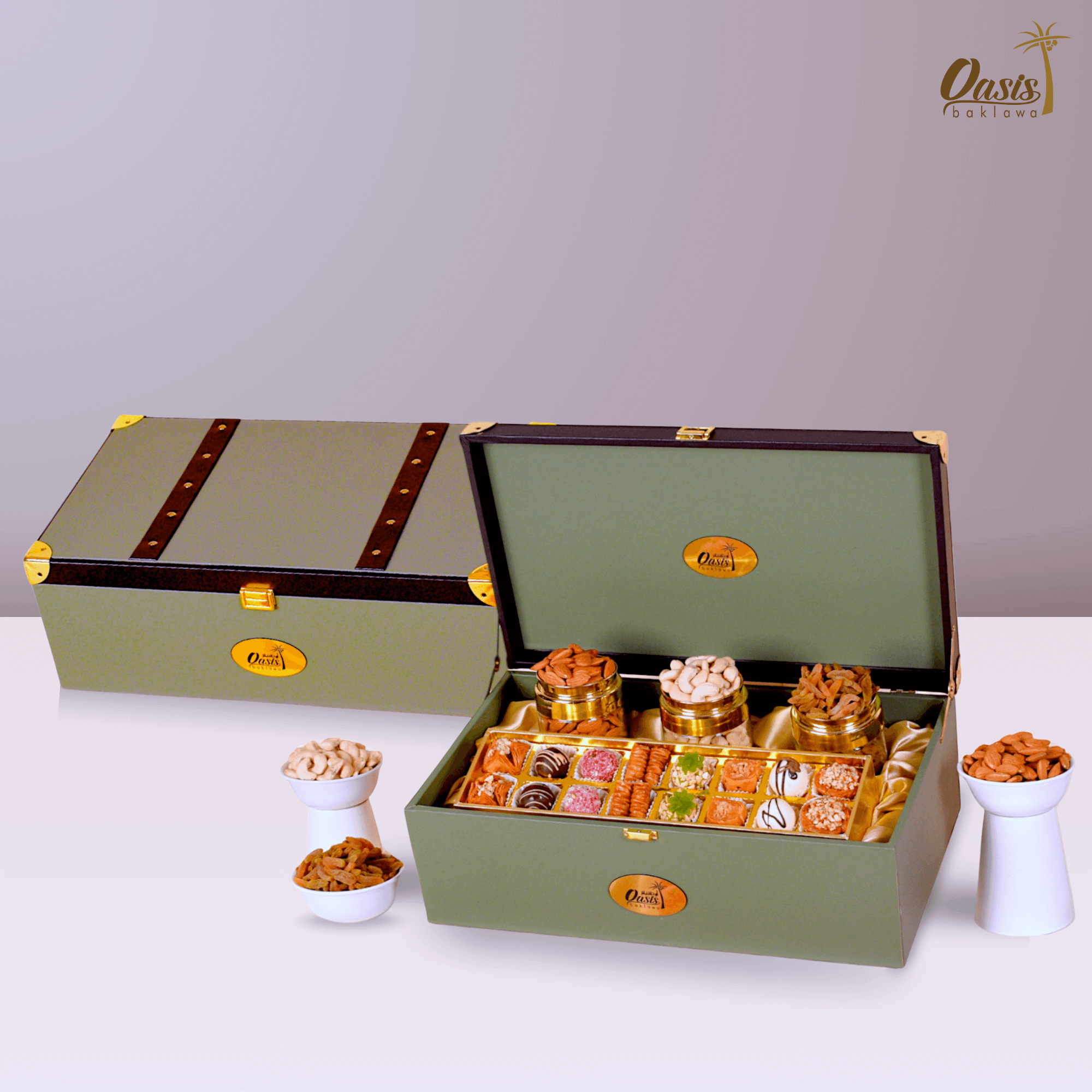 Dream isn’t just a gift—it’s an experience. This vintage-style trunk opens to reveal colorful baklawa, premium dry fruits in golden jars, and packaging so beautiful people will keep it forever. Perfect for when you need to seriously impress someone.