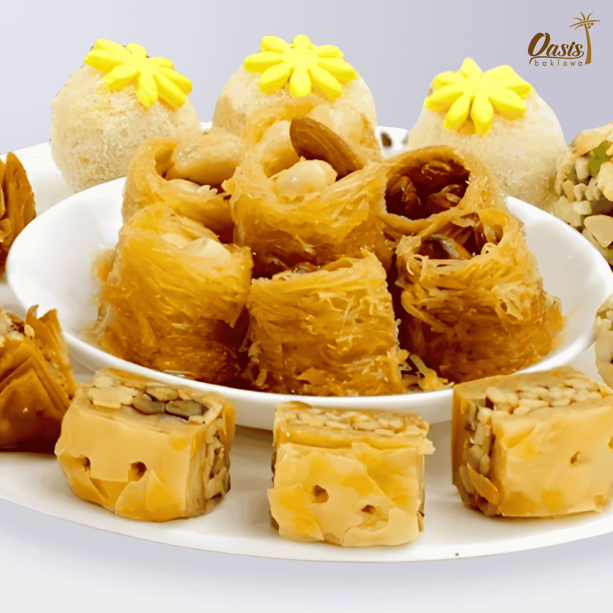 You’ve got 16 pieces of assorted baklawa arranged in the main tray. Green pistachio-topped squares, yellow cream-topped ones, white coconut varieties, and those classic rolled pieces. Each row’s color-coordinated, which makes the whole thing look like it belongs in a fancy bakery window.