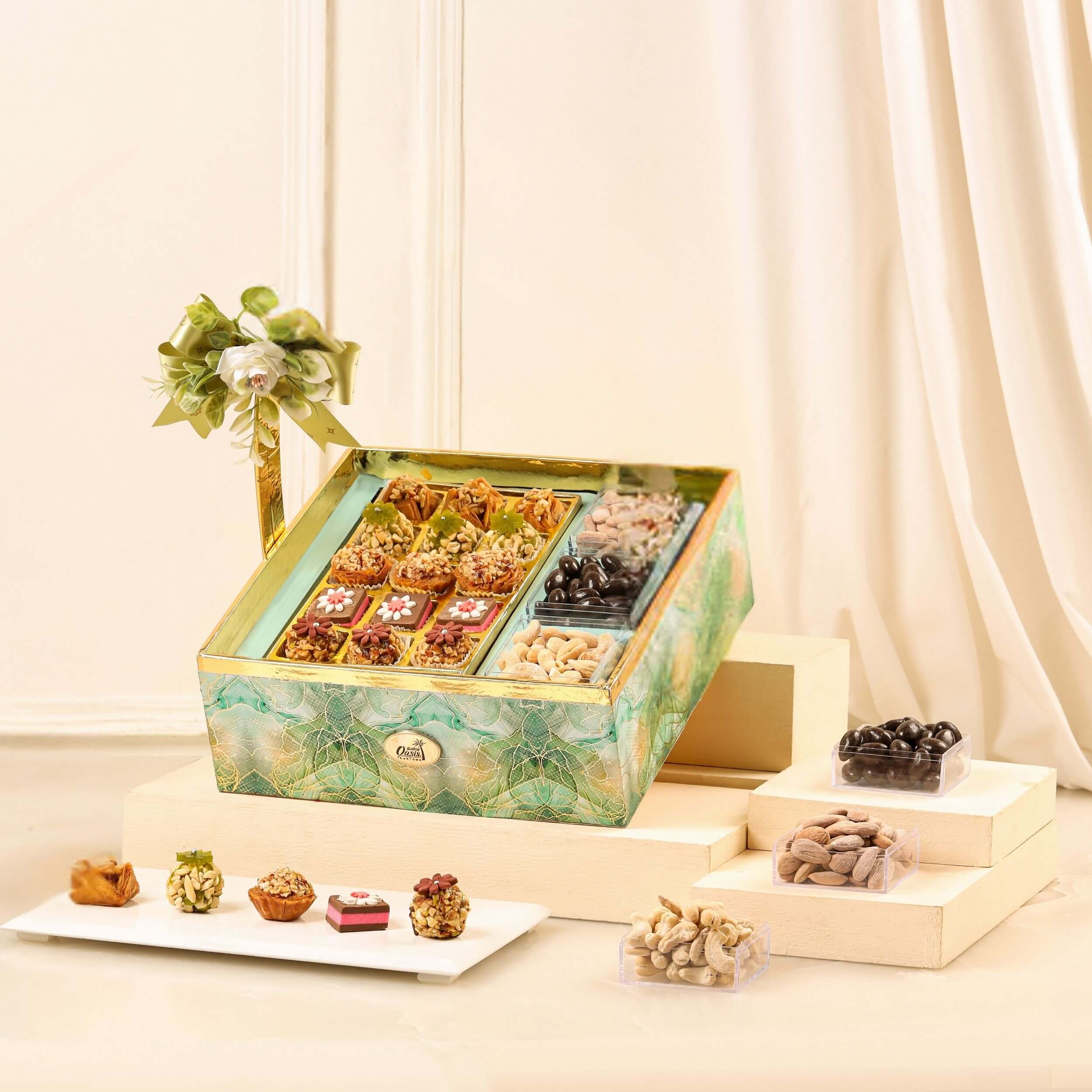 Discover the true essence of indulgence with our exquisitely curated ESSENCE Basket Hamper – a luxurious assortment of handcrafted baklawa, fusion sweets, gourmet chocolates, and savoury dry fruits. Thoughtfully packed for elegance and delight, it’s the perfect gift for weddings, Diwali, Rakhi, Holi, and all your cherished occasions.