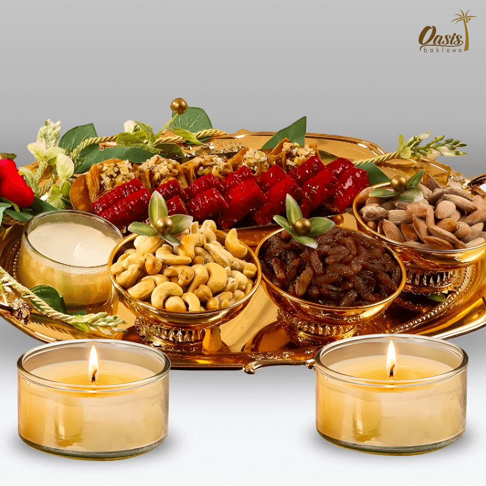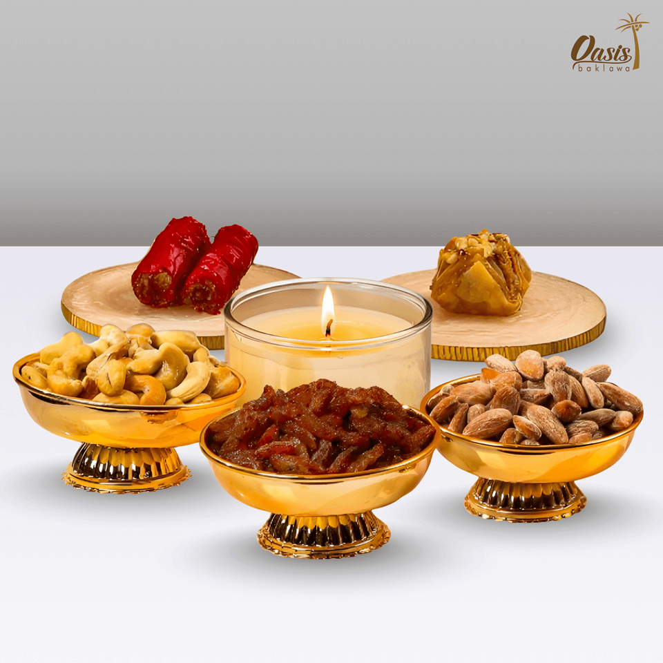 Delight in the Europa Trio Premium Gift Box, a curated selection of gourmet baklawa, salted nuts, and a fragrant candle. The perfect gift for any special occasion.