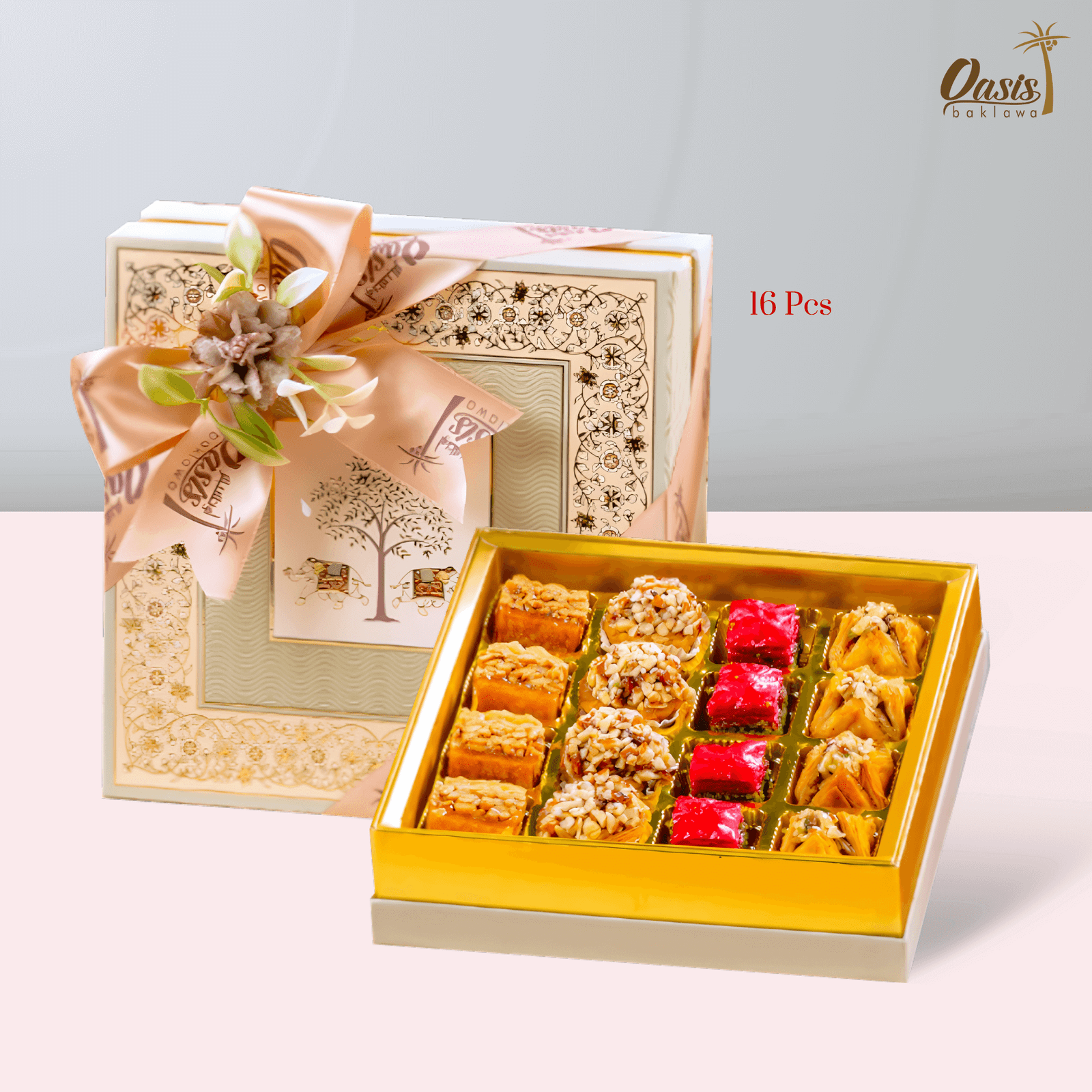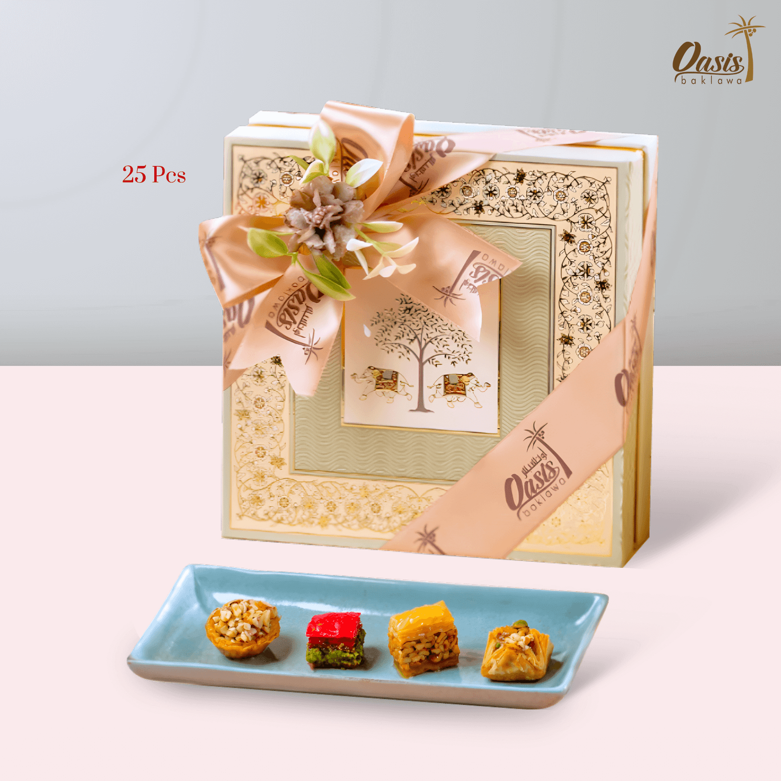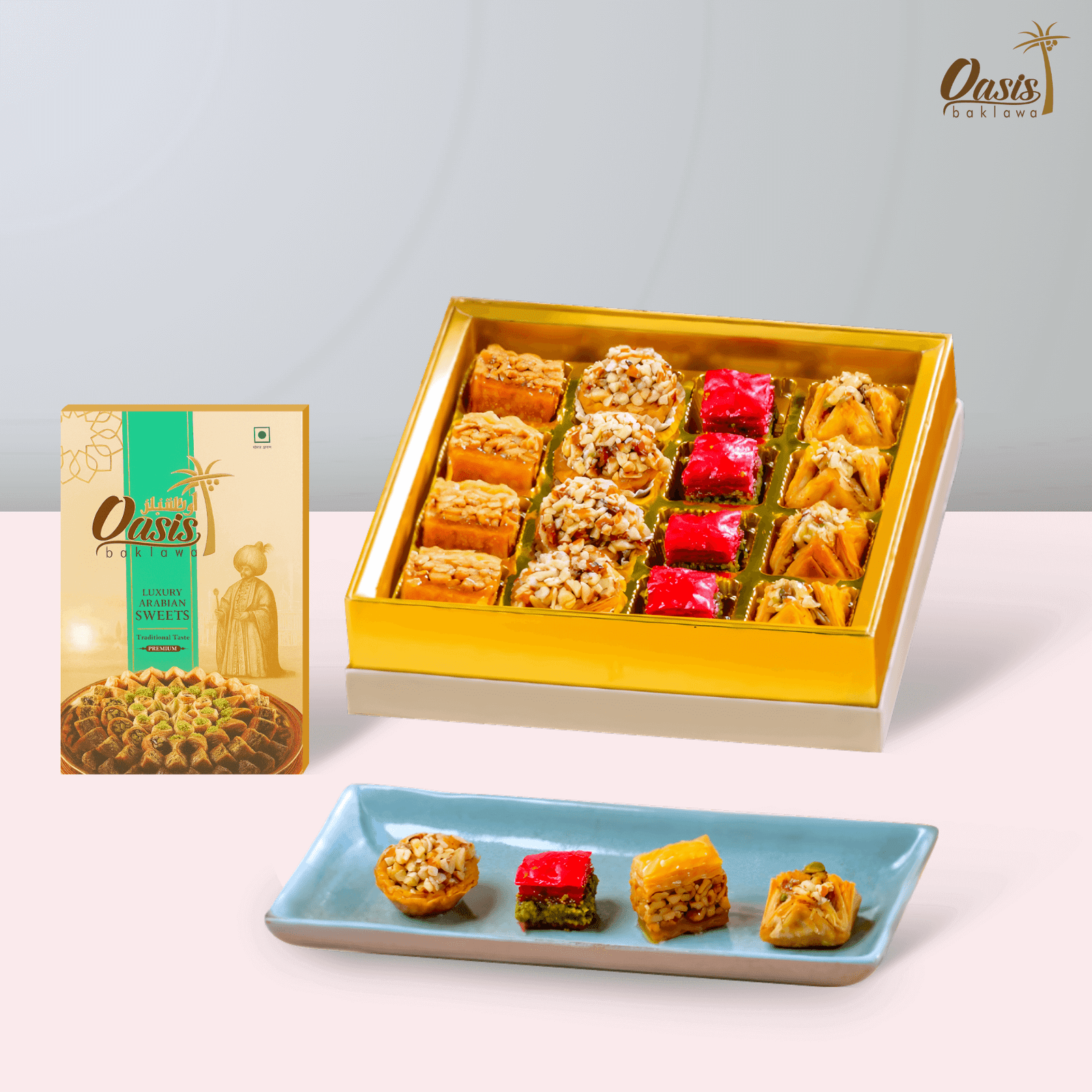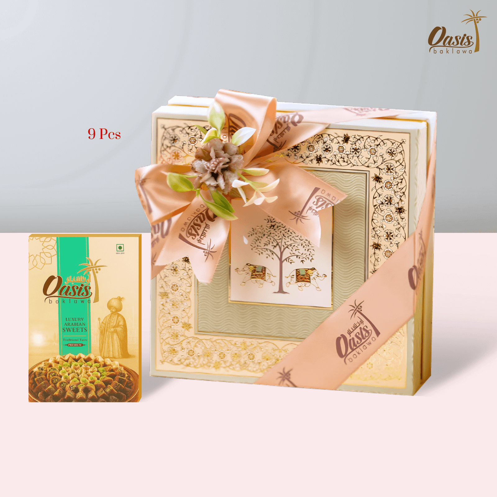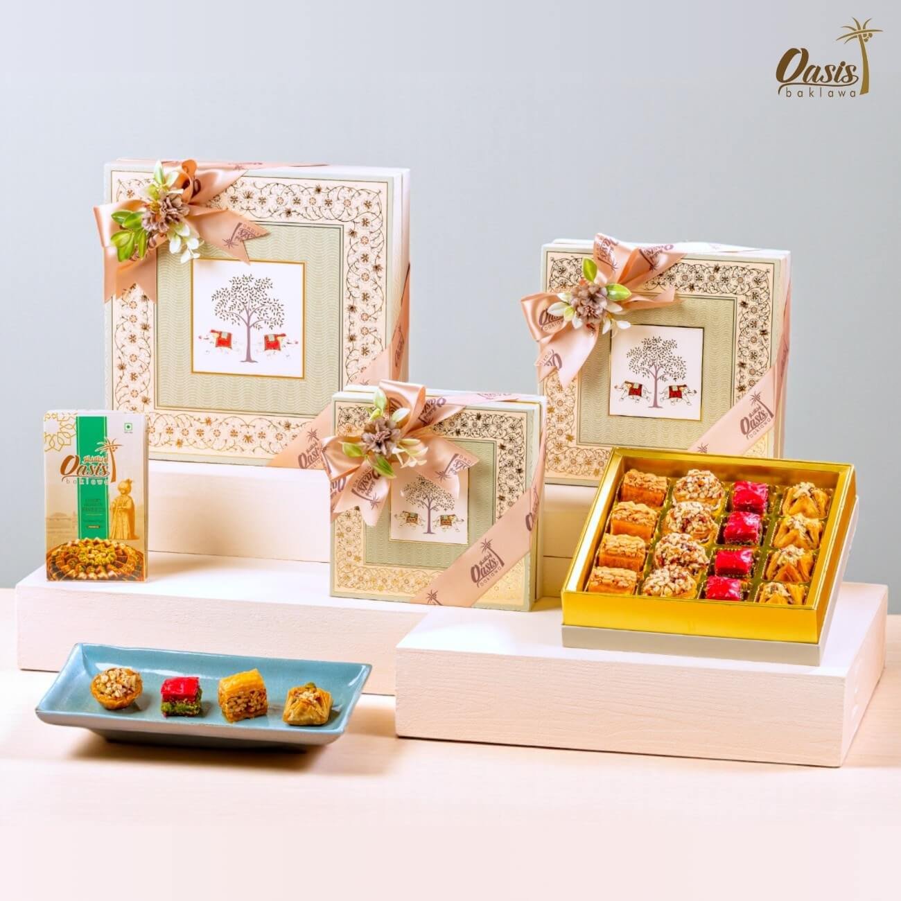 The 25-piece (₹1,395) though? That’s when you need to make a statement. Weddings, big Diwali gatherings, serious corporate gifts—this size handles all of that. The frame’s grand, you’ve got 25 pieces of baklawa, and yeah, people remember who gave them this one.