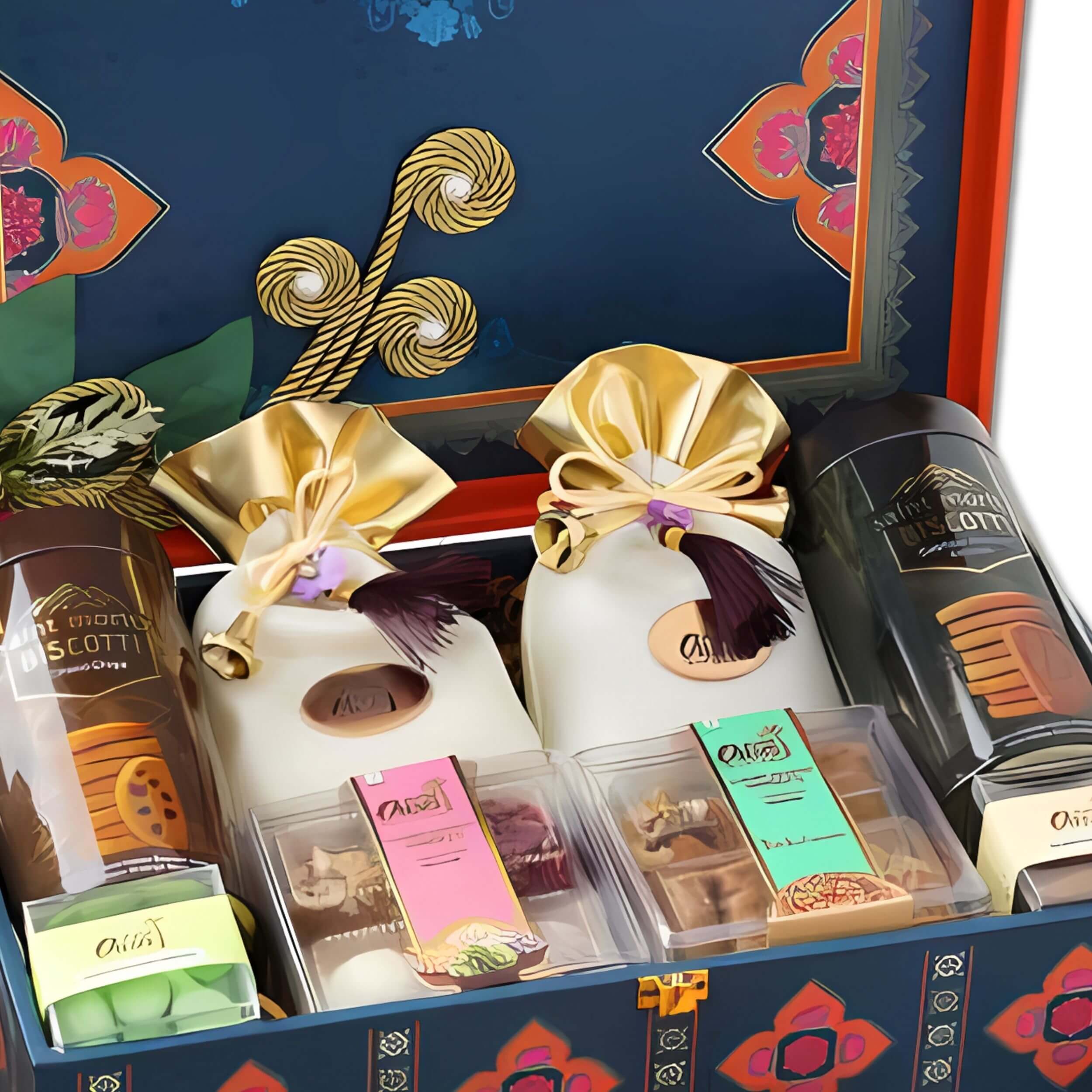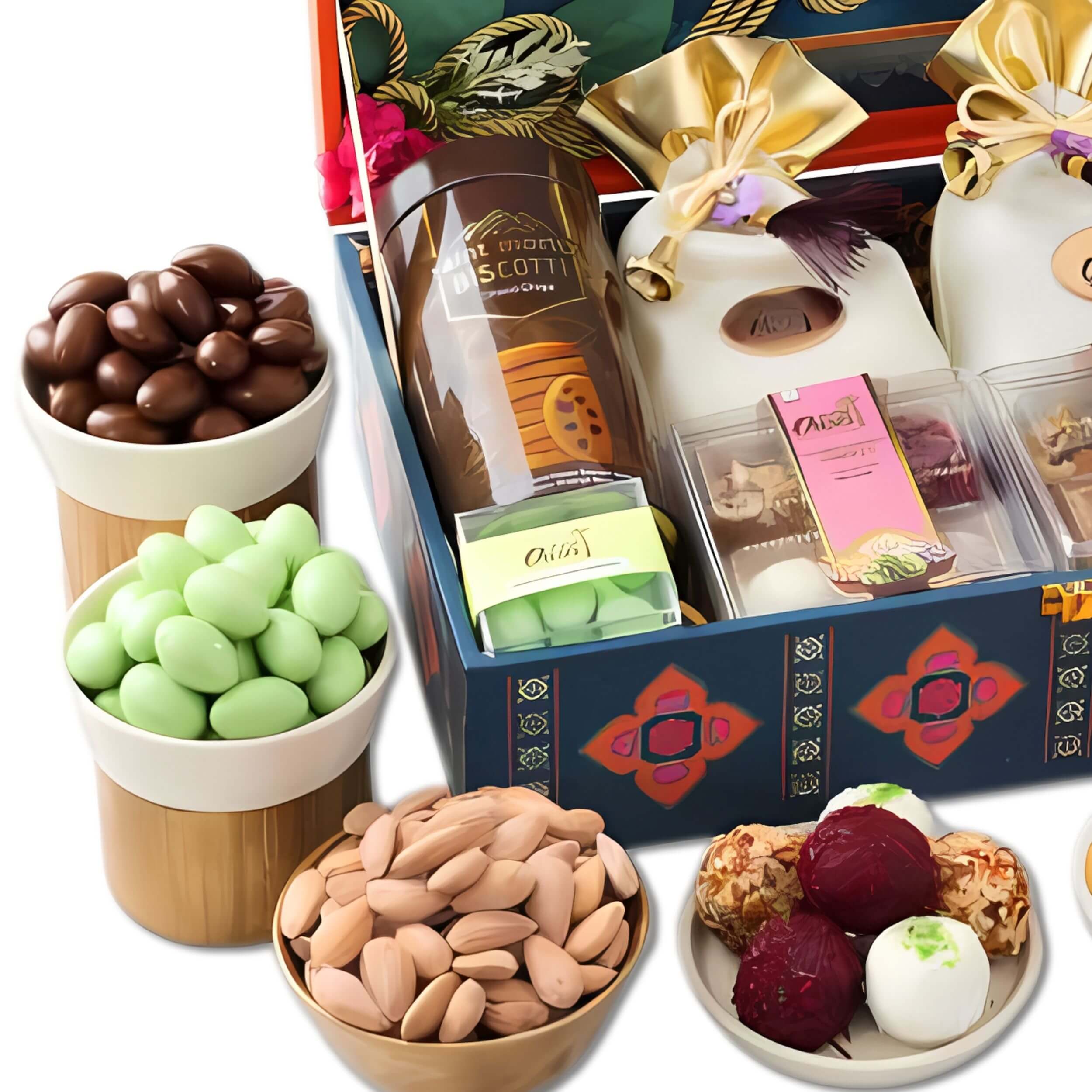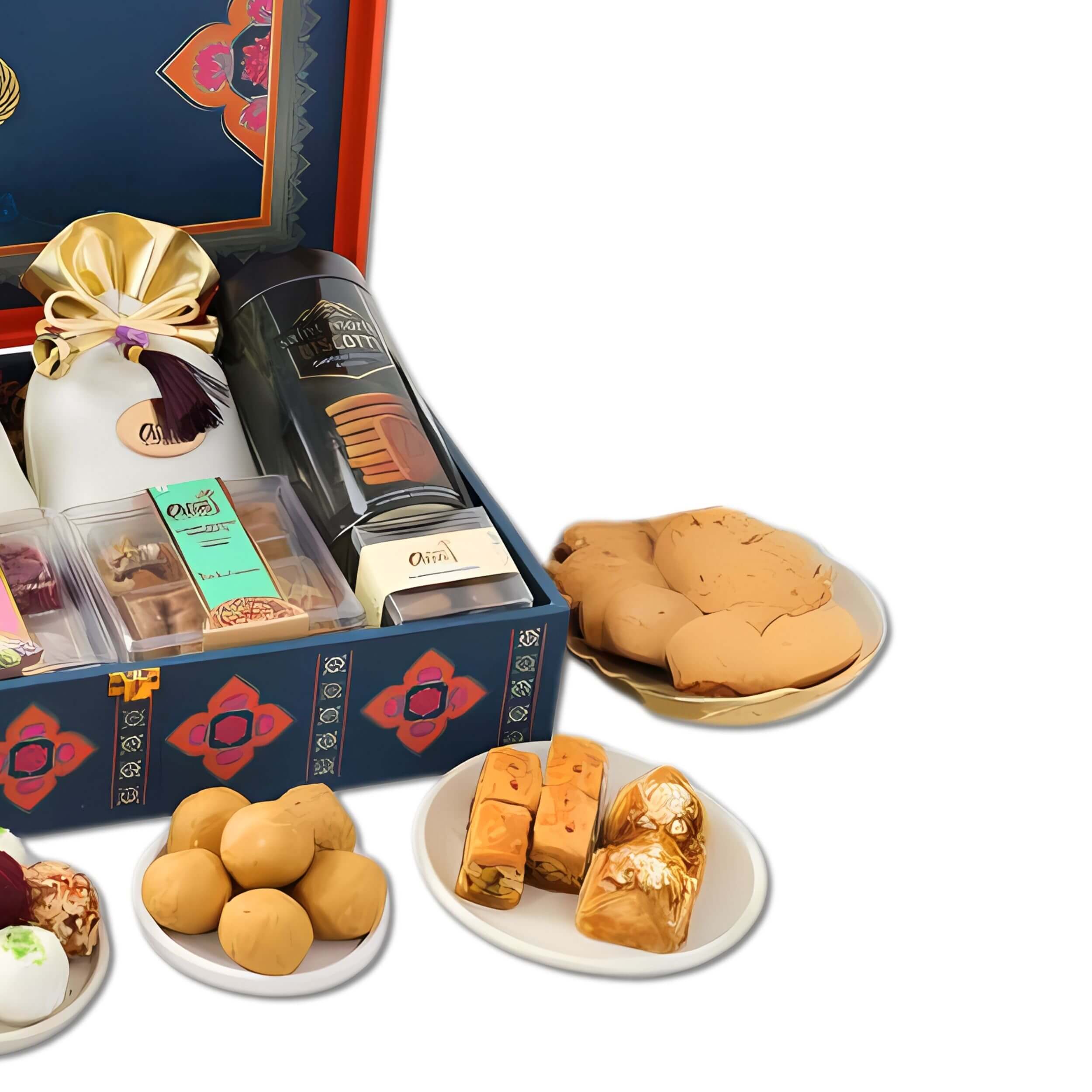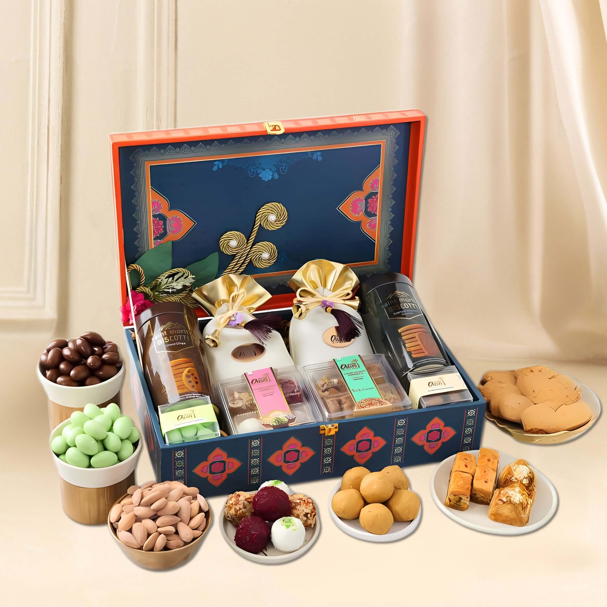 The Grande Boxy Gift Hamper is a rich, multi-textured assortment of premium gourmet delights — from crunchy biscotti and classic baklava to fusion sweets, nutty balls, and candy-coated almonds. This hamper is the perfect blend of traditional indulgence and modern taste, ideal for Diwali, weddings, Rakhi, Holi, and luxurious gifting occasions.