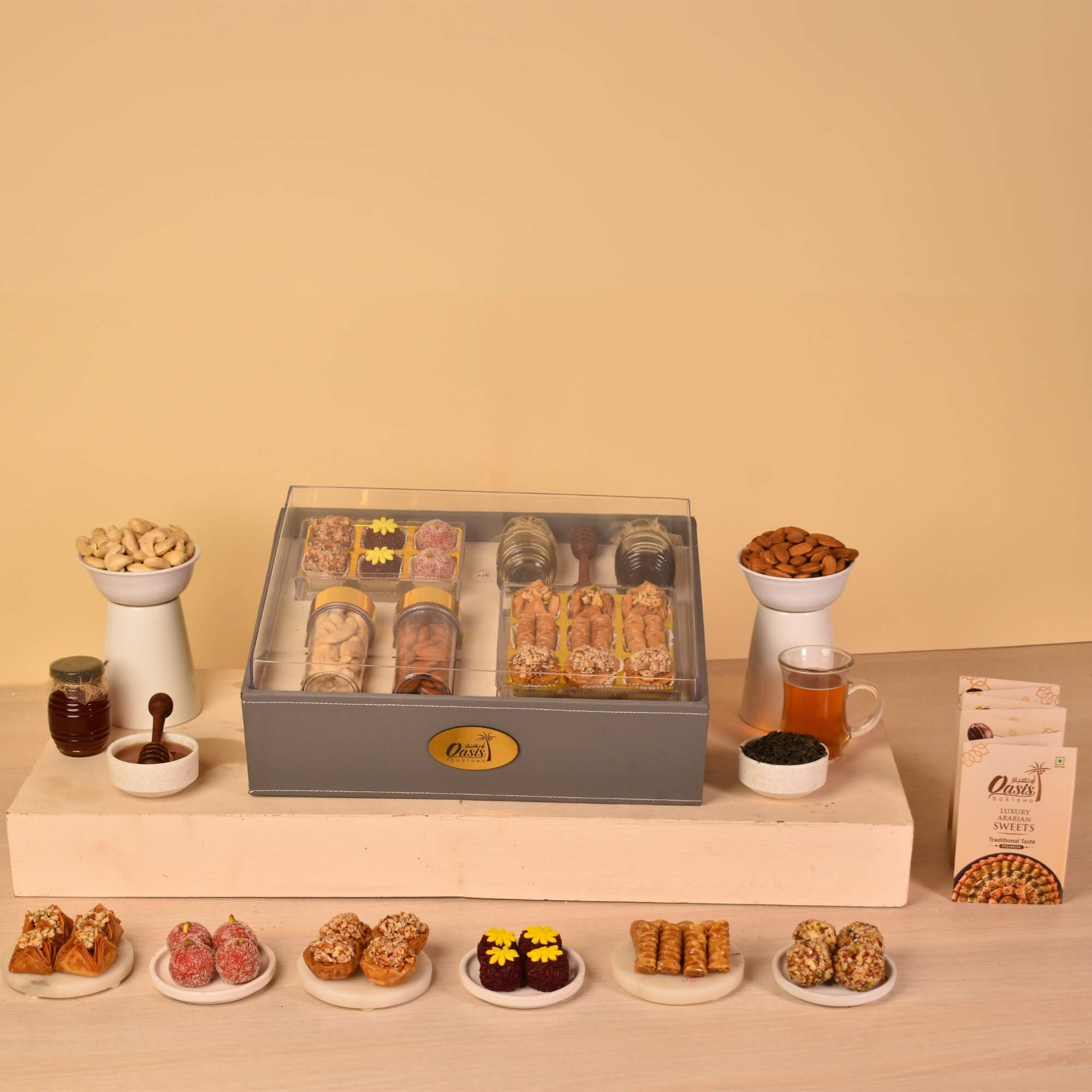 The Oasis Wellness Delight Hamper is a thoughtfully curated blend of health, indulgence, and luxury. Combining nutritious dry fruits, premium tea and honey, and our signature sweets, this hamper makes for a perfect gift of warmth and care.
