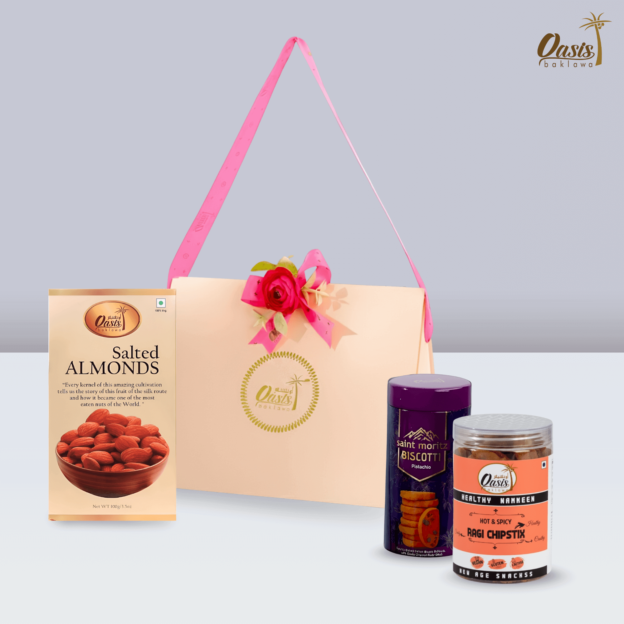 At ₹1,395, you’re getting variety and quality. If someone handed you this, you’d feel like they actually thought about what goes into a good gift. The hanging bag format also means it’s easy to carry and looks good hanging on a door or hook until they’re ready to dig in.