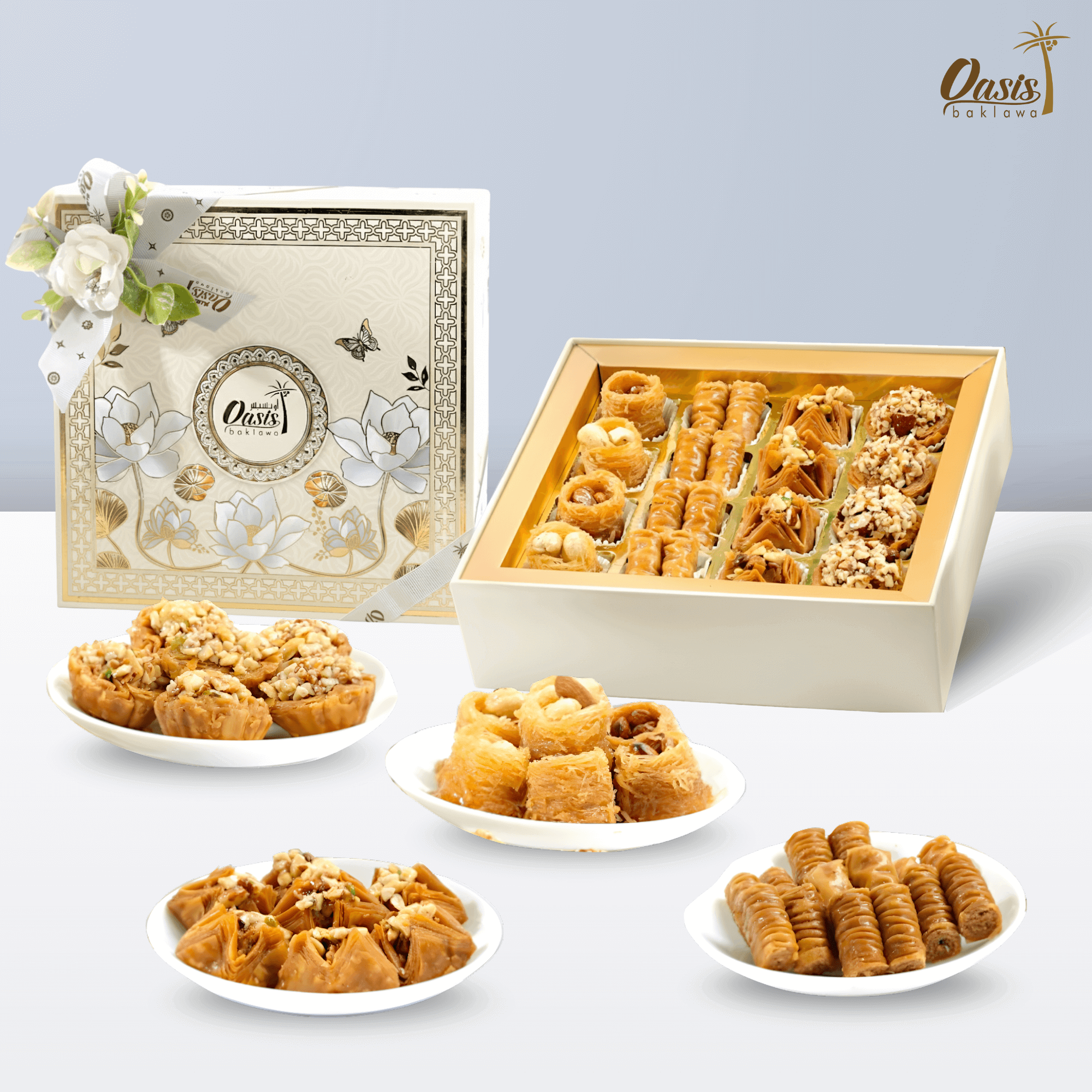 Lotus 16 brings together the best of both worlds—authentic Turkish baklawa and premium roasted nuts, all packaged in this gorgeous white decorative box. Great for weddings, festivals, or when you really want to spoil someone.