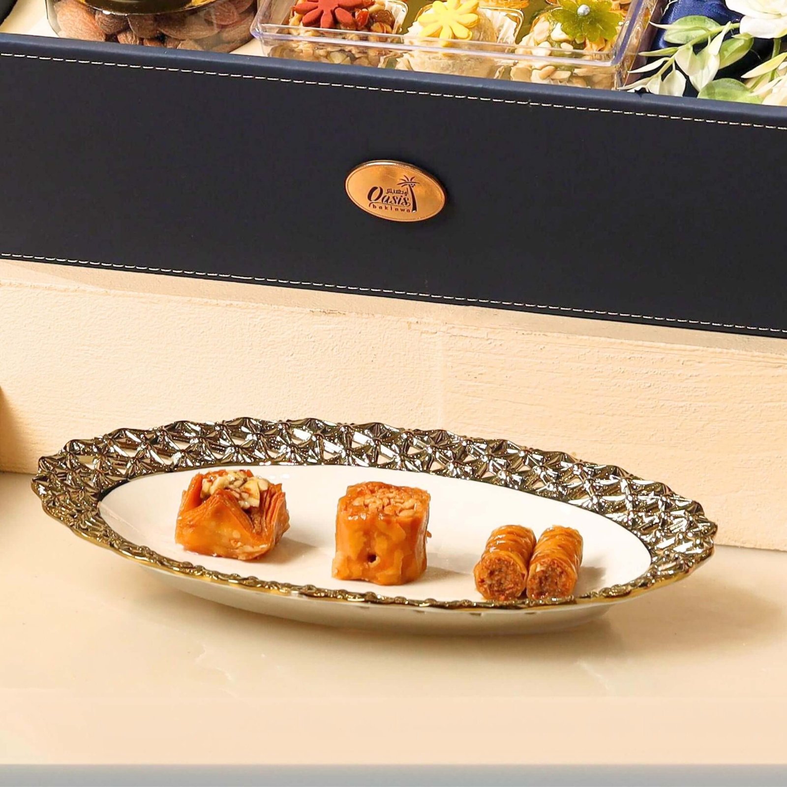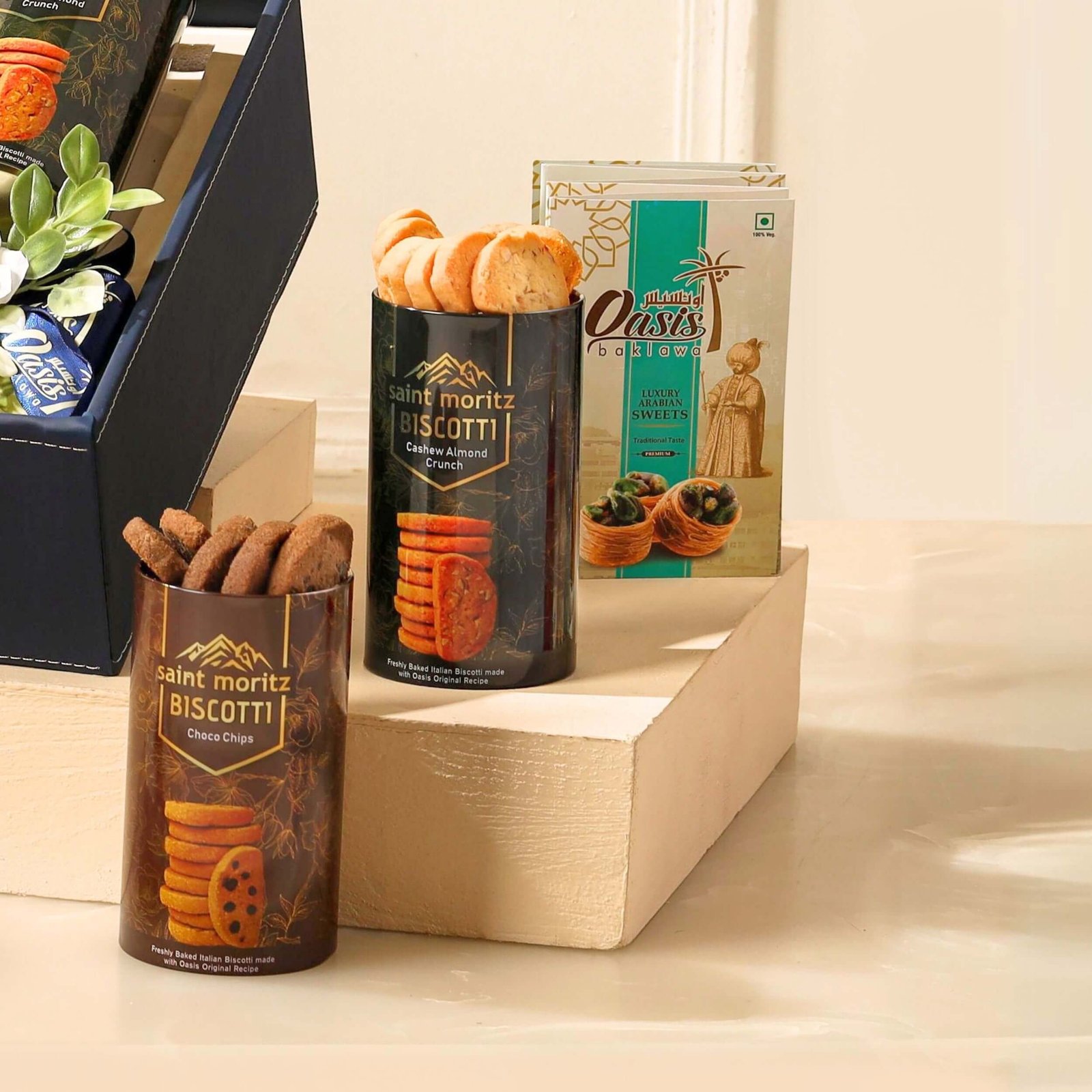 The Majesty Gift Hamper is a regal assortment of Oasis Baklawa’s finest offerings – a luxurious blend of gourmet baklawa, Indian fusion sweets, artisanal biscotti, and premium dry fruits. Thoughtfully presented in a rich festive box, it’s perfect for Diwali, Rakhi, Holi, weddings, or any occasion where your gift needs to stand out.
