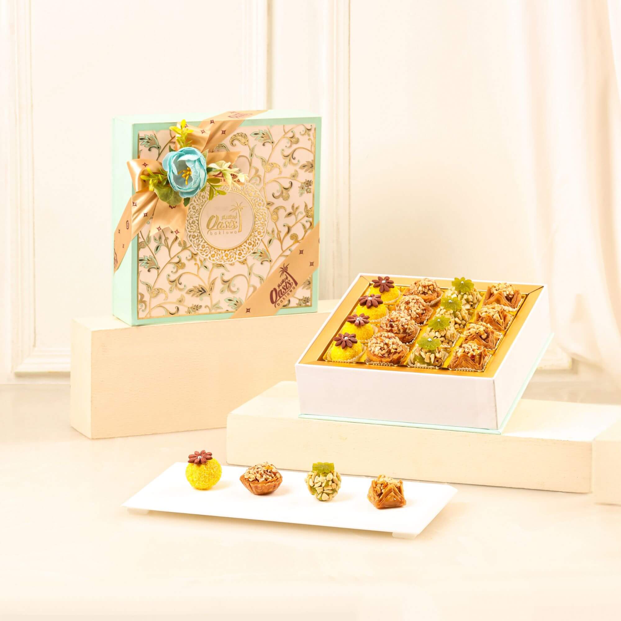 The Marine Collection Baklawa Gift Hampers Boxes by Oasis Baklawa is a refined celebration of flavour, beauty, and heritage. Inspired by the calm elegance of ocean hues, this luxurious hamper features premium, handcrafted baklawa sweets made with rich dry fruits, crisp phyllo layers, and pure ghee.