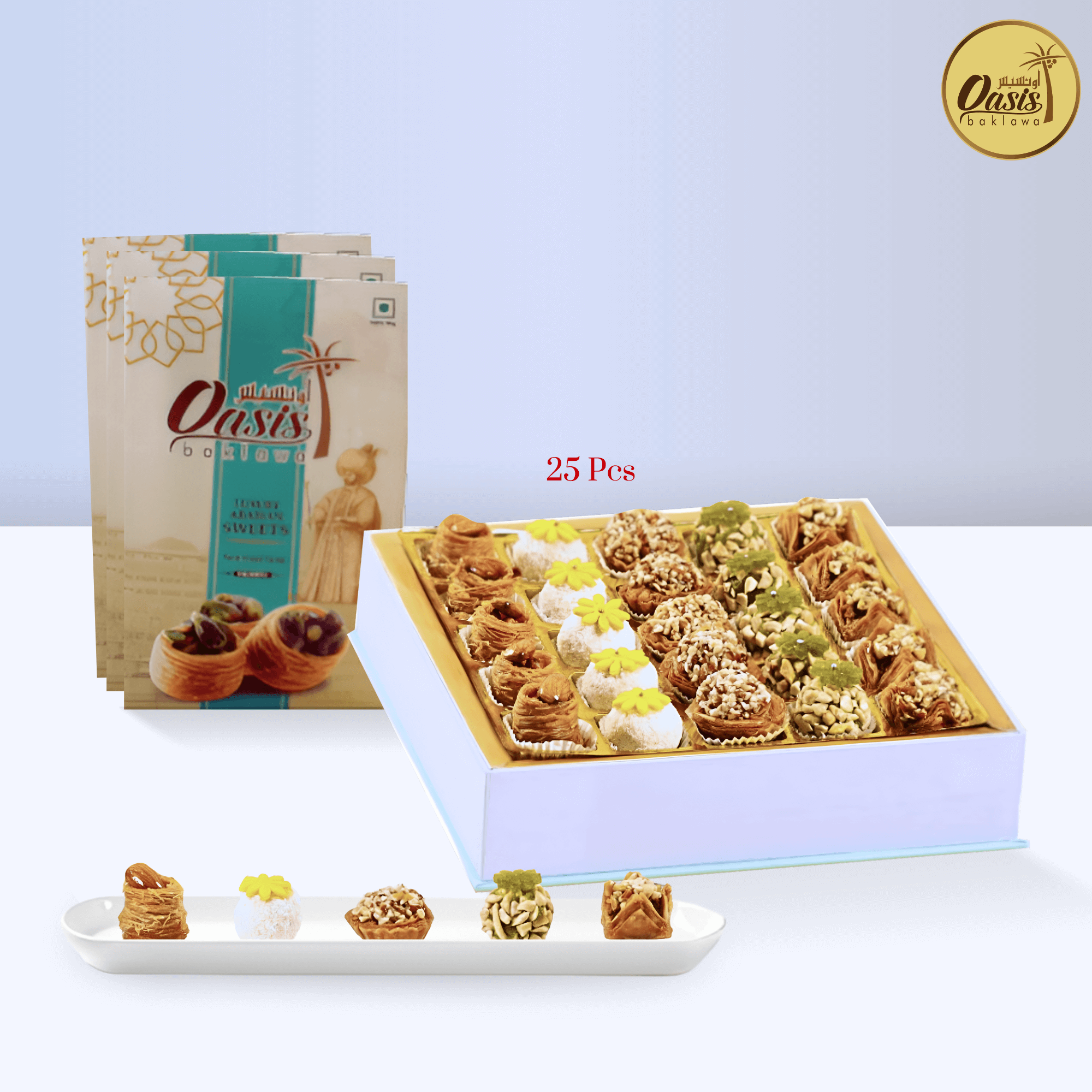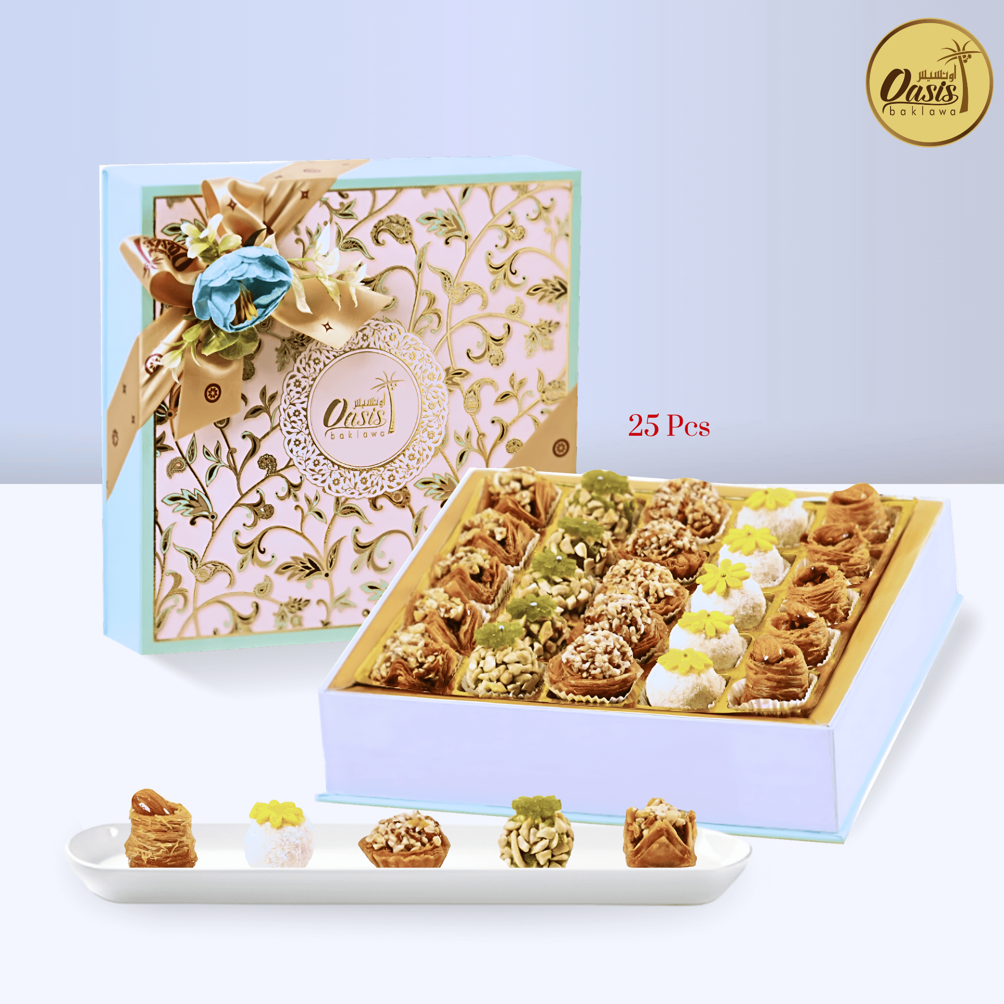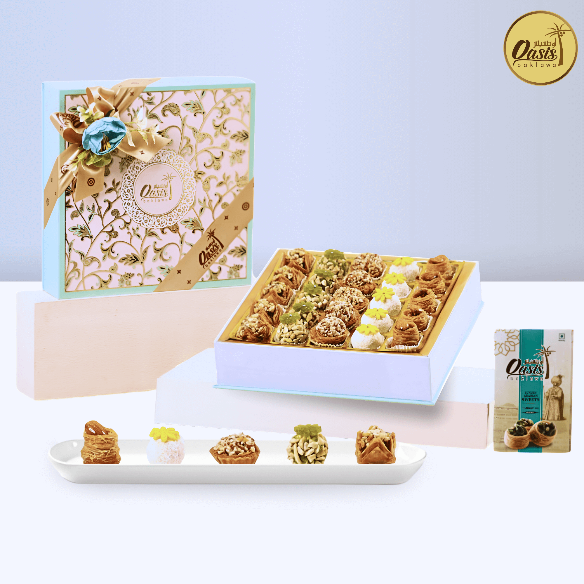 This collection brings together five delicious varieties, with five pieces of each. You’ll find the nutty crunch of the Pyramid Special, the rich and delicate Almond Tart, and the fine pastry nests of Osh-El-Bulbul Almond. If you’re in the mood for something different, the Coconut Ball brings a touch of tropical sweetness, while the Kacha Aam Ball adds a tangy, refreshing twist—together making the box even more fun to enjoy. Whether it’s a thoughtful gift, a treat for a celebration, or simply something to enjoy at home, this box brings together flavour, tradition, and luxury in every bite.