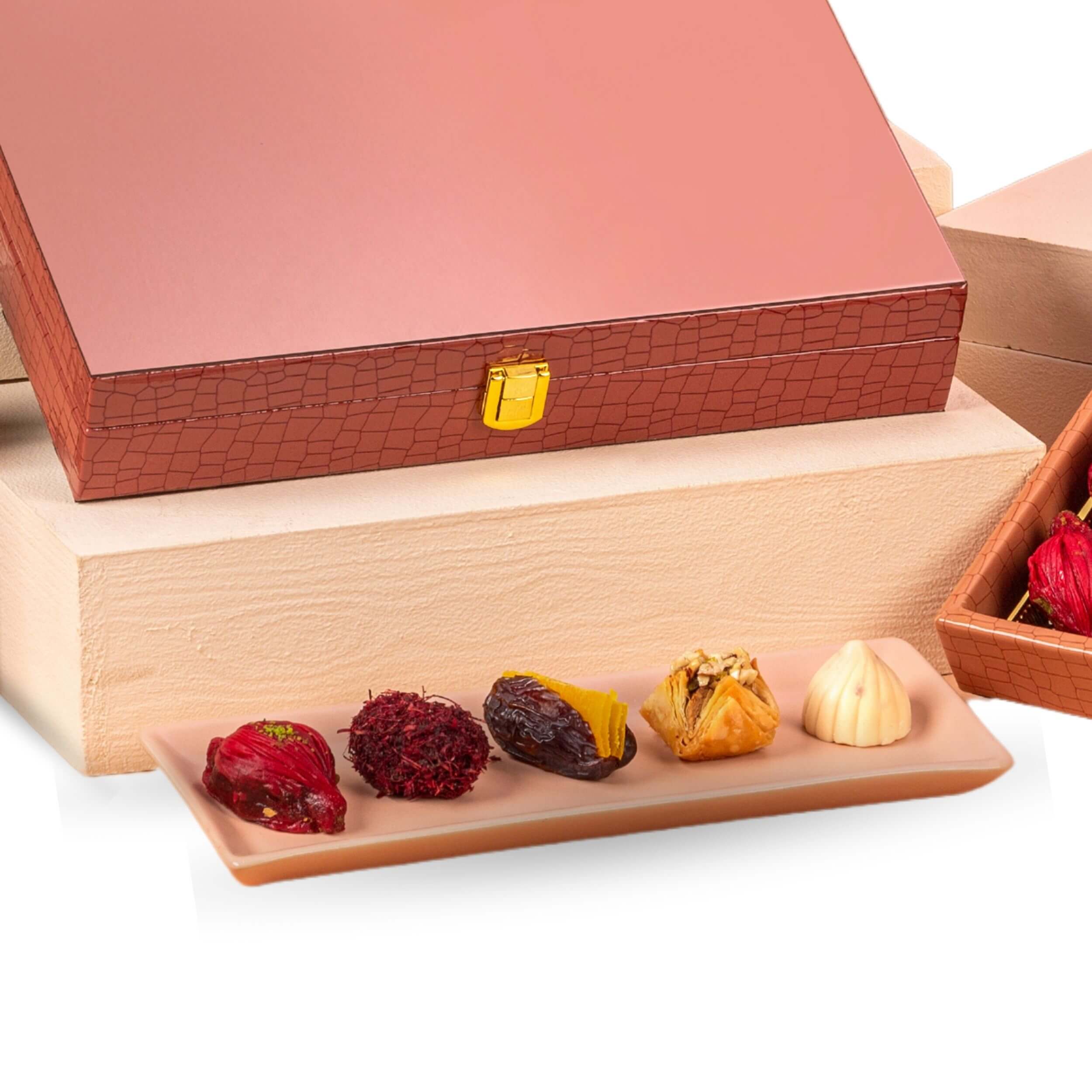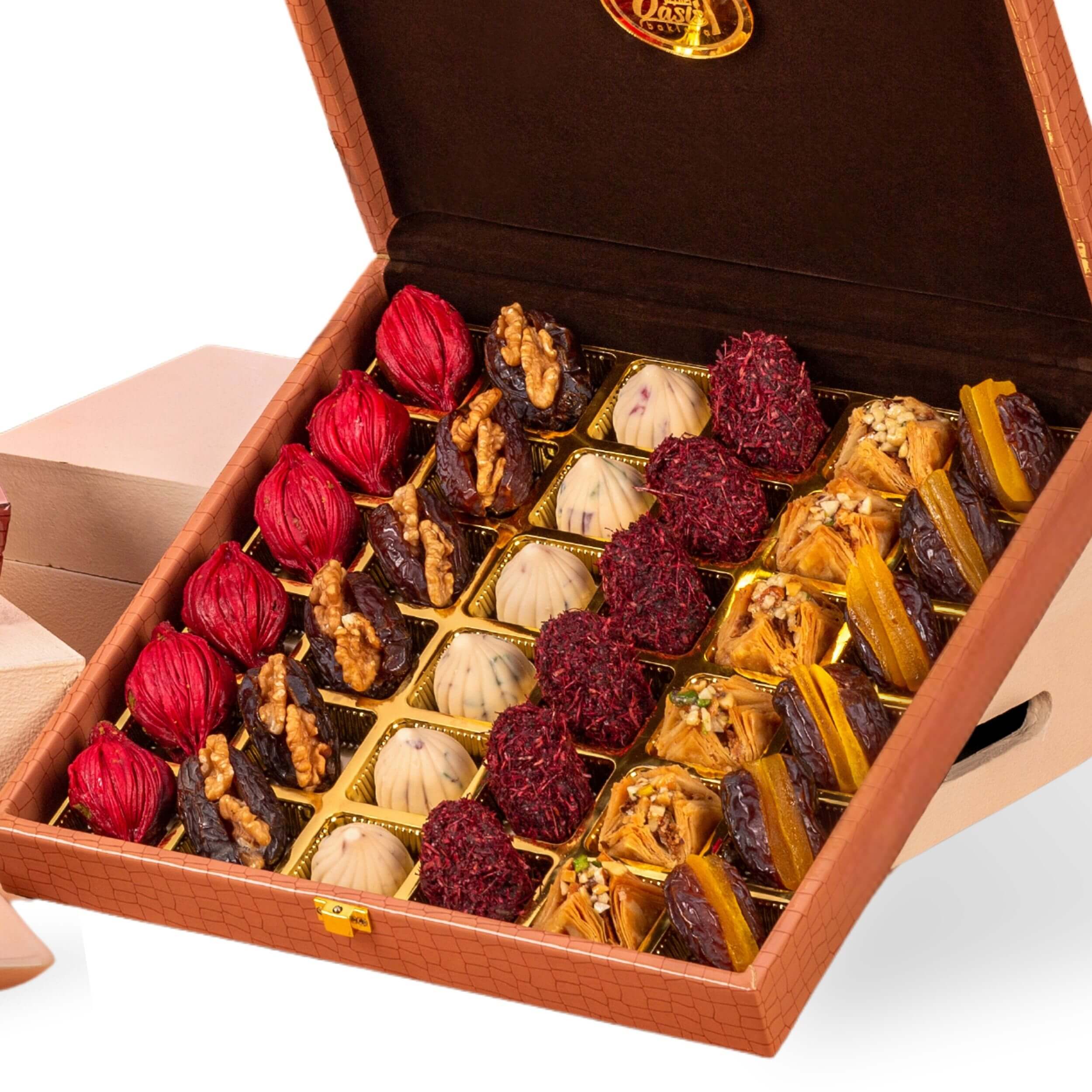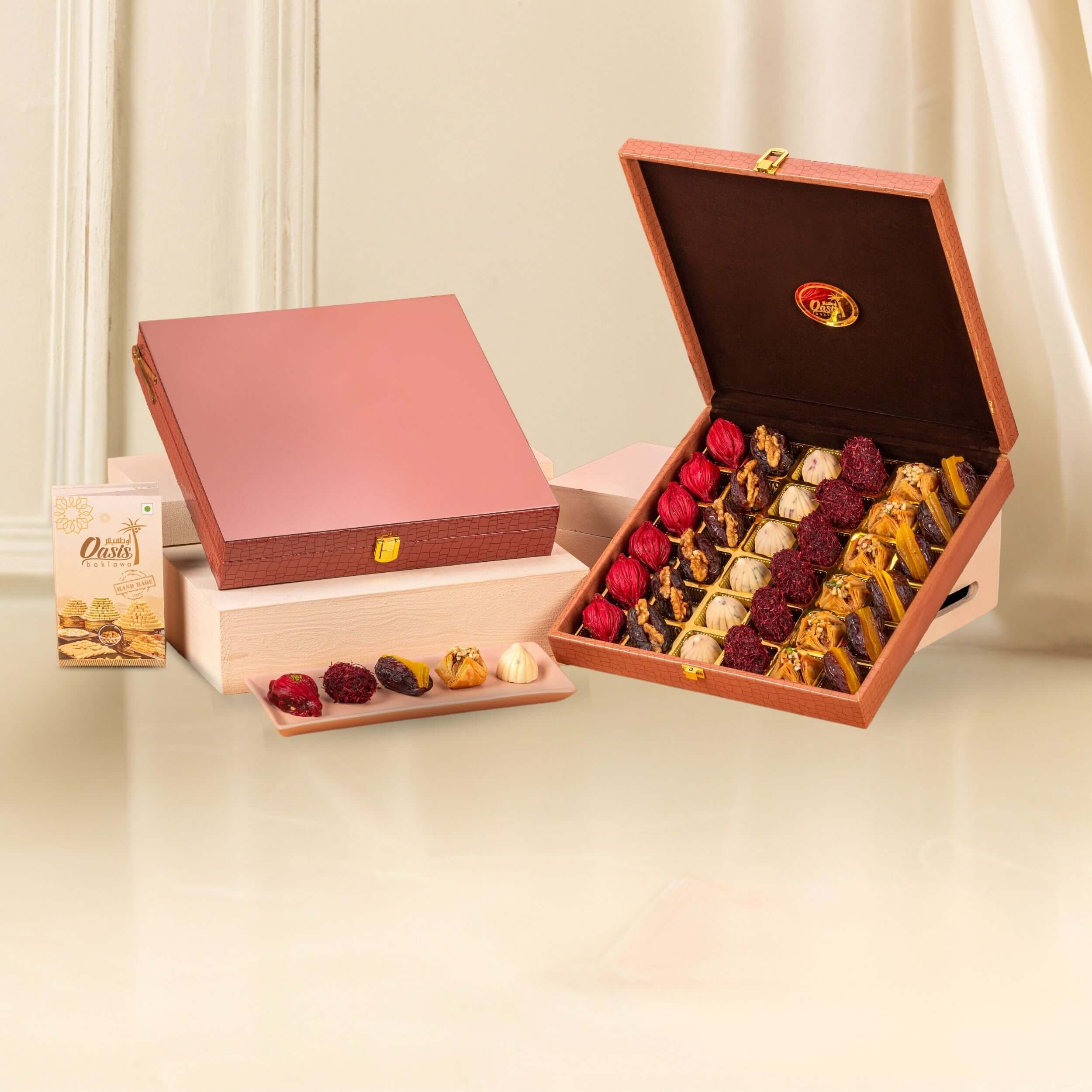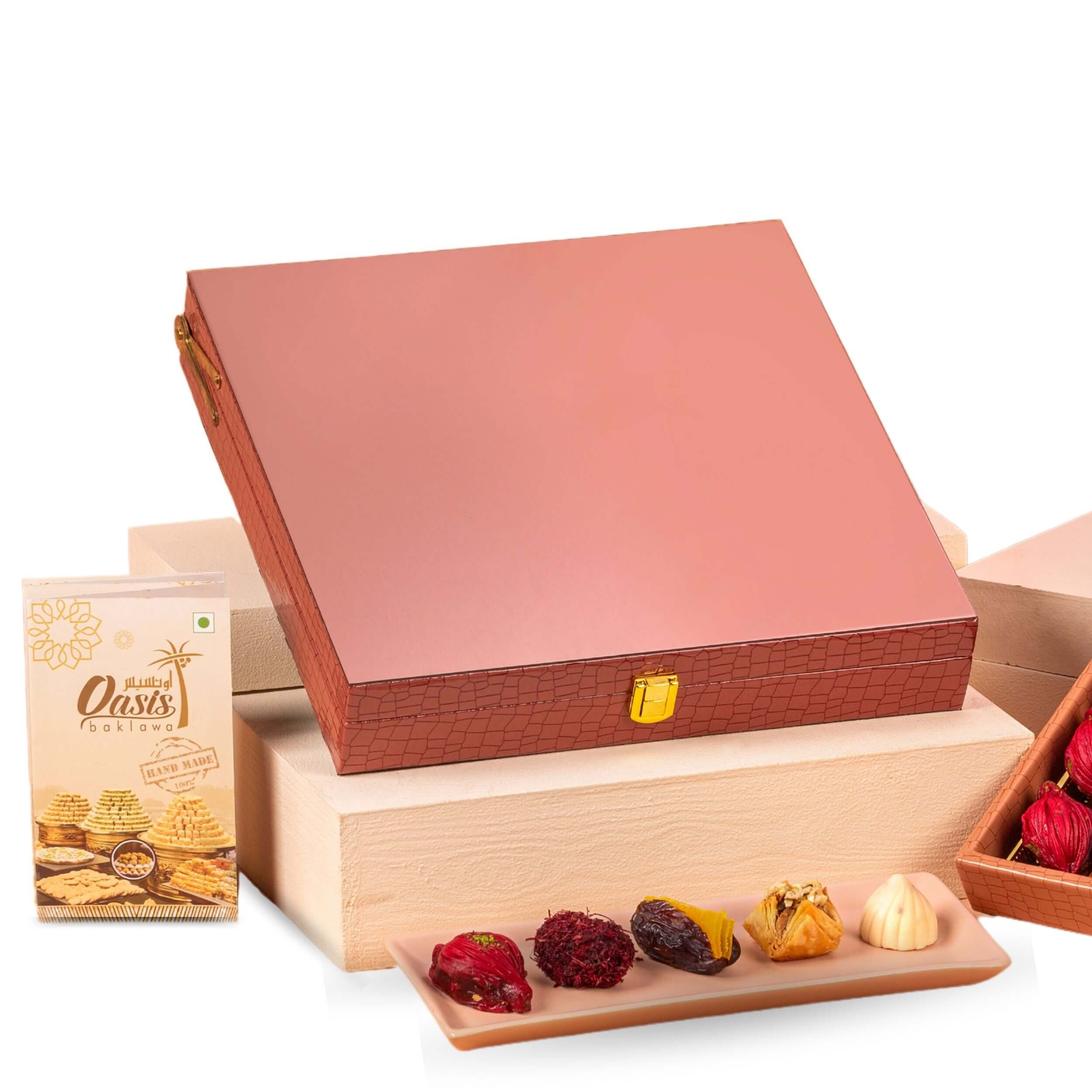 The Mirage 36 Gift Hamper is a dazzling collection of 36 premium sweets, blending traditional baklawa, fusion modaks, and rich Middle Eastern delights. Designed to impress, this hamper is a statement of fine taste and thoughtful gifting — perfect for Diwali, Rakhi, Holi, weddings, and special celebrations.