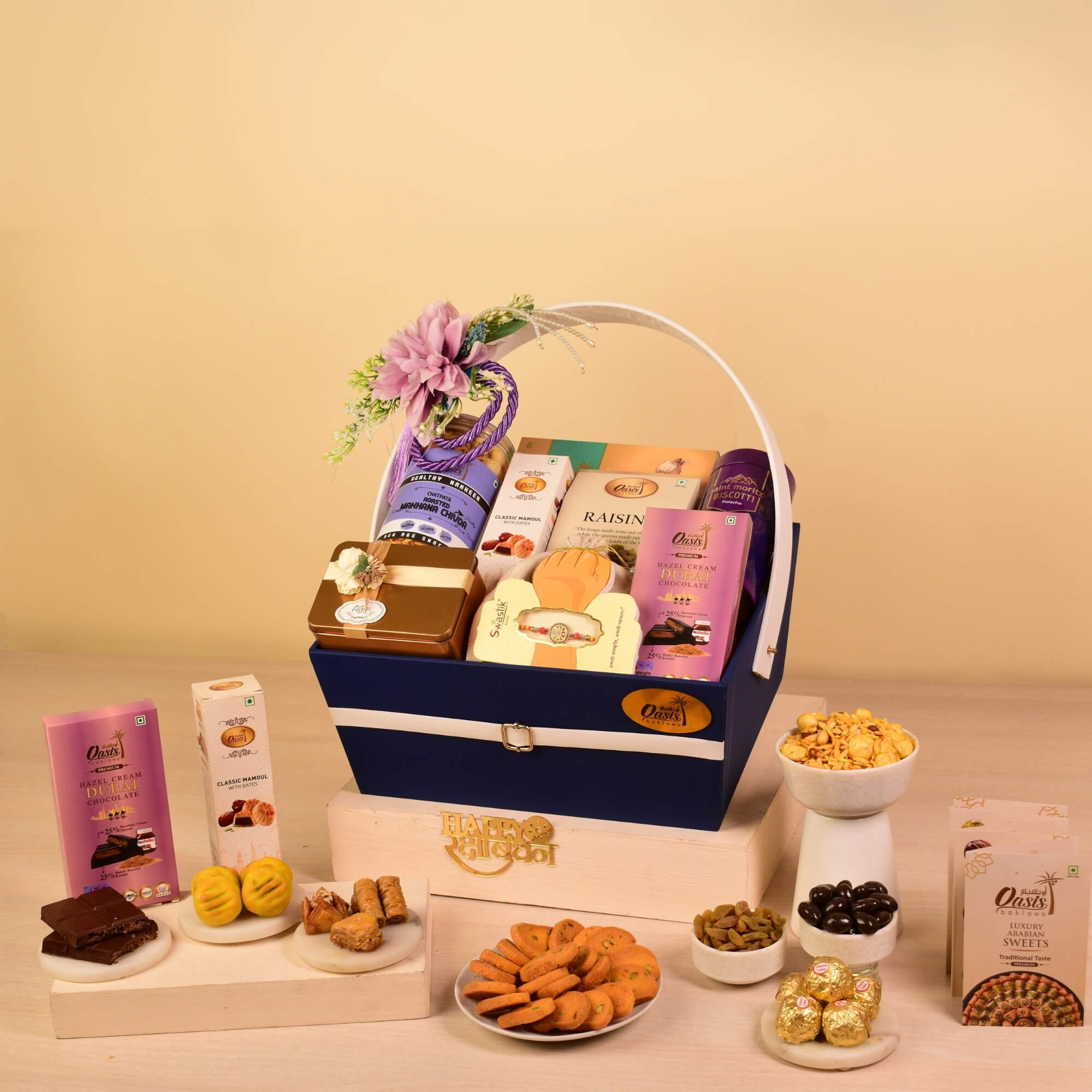 The Oasis Indulgence Gift Basket is a beautifully curated hamper that brings together global flavors and traditional favorites. From rich Nutella-filled chocolates to buttery biscotti, nutritious snacks, and authentic Middle Eastern sweets — this hamper offers something special for every taste.