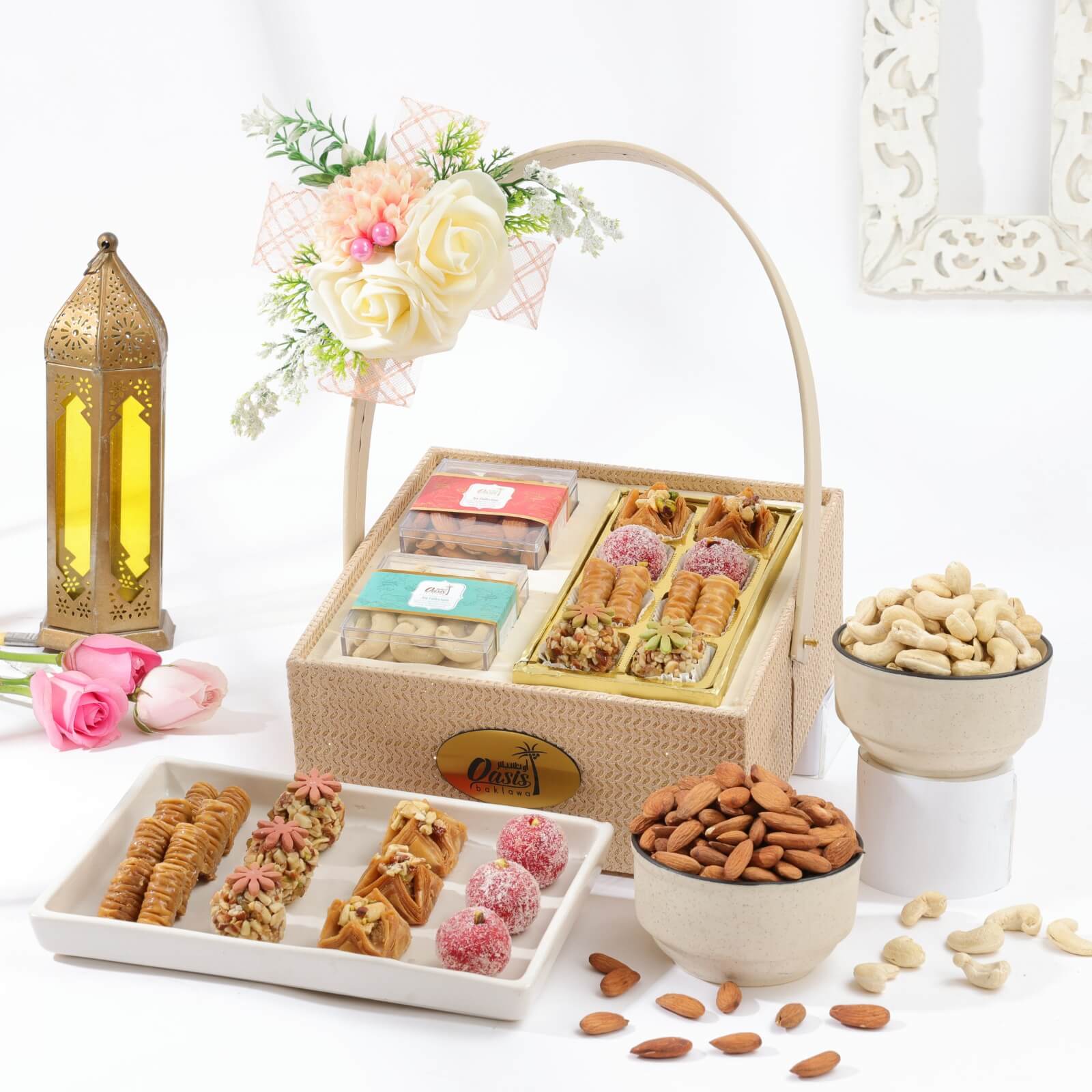 Delight in the timeless charm of the Premium Classic Bloom Hamper, a perfect gift combining sweet indulgences and premium dry fruits. Featuring handcrafted assorted baklawa and sweets alongside crunchy salted almonds and cashews, this hamper is elegantly finished with floral decorations (as per image) for a beautiful presentation.