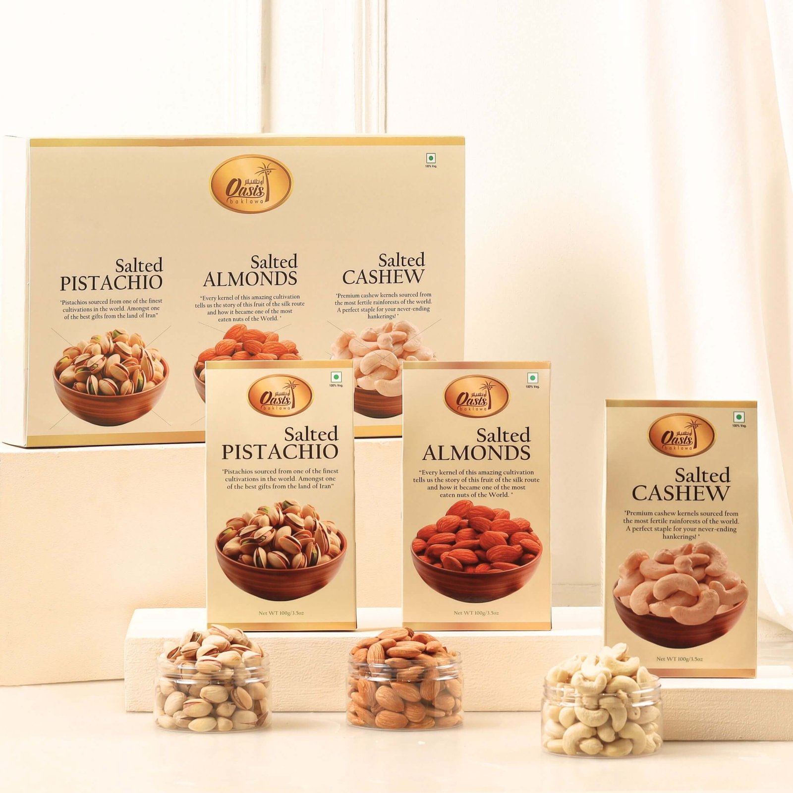 Premium Salted Dry Fruits Gift Pack – 3 x 100g (Almonds, Cashews, Pistachios)