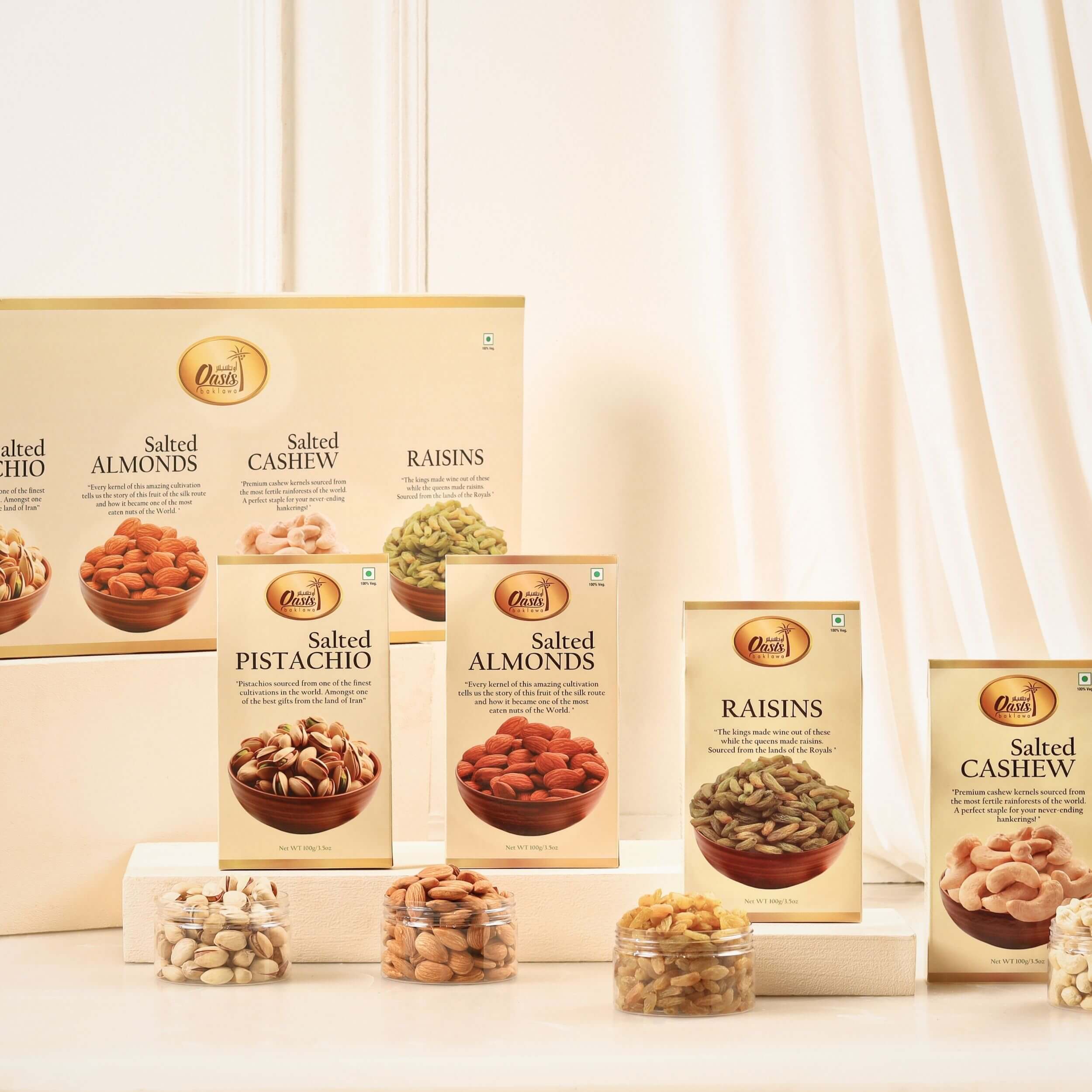 Elevate your gifting experience with our Premium Salted Dry Fruit Box featuring four gourmet-grade dry fruits — Salted Almonds, Salted Cashews, Salted Pistachios, and Raisins, each thoughtfully packed in 100g portions.