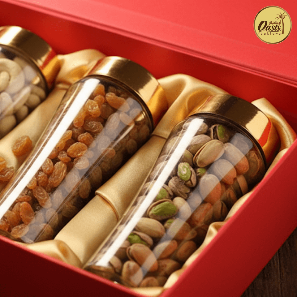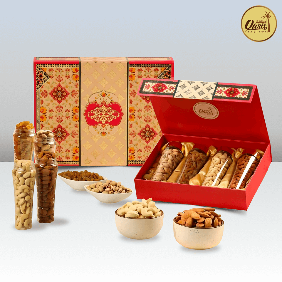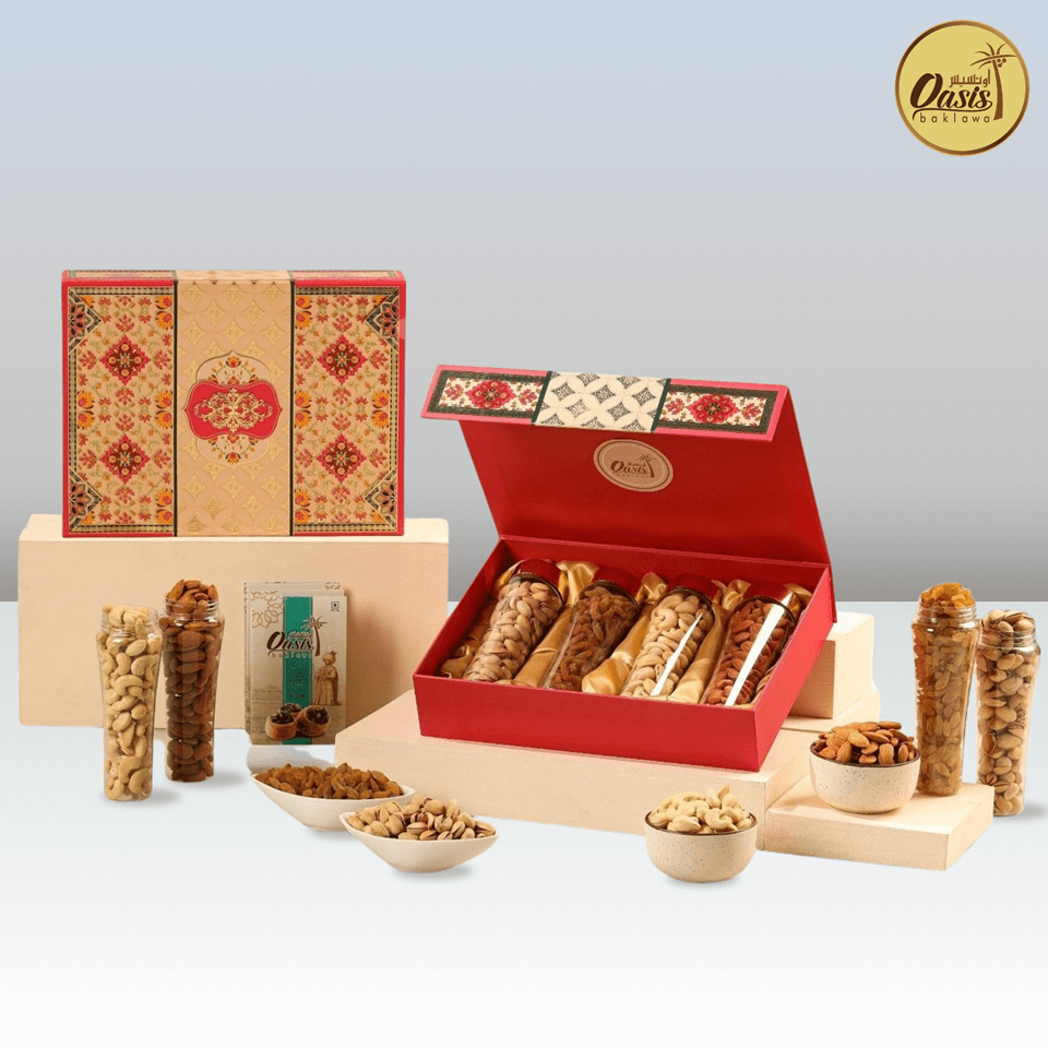Inside this beautifully presented gift box, you’ll find four transparent jars, each filled with 170g of premium delights. Enjoy the perfect crunch and savory flavor of Salted Cashews and Salted Almonds.For a more earthy and satisfying snack, there are the perfectly seasoned Salted Pistachios.