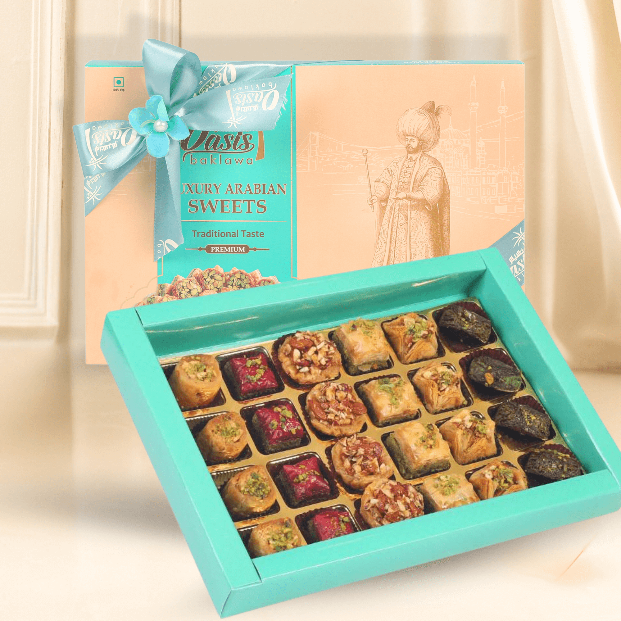 Introducing the Sultan Collection by Oasis Baklawa – a regal range of assorted handcrafted baklawa, inspired by the rich traditions of royal Middle Eastern sweets. Available in elegant boxes of 6, 12, 18, 24, and 30 pieces, this collection features a curated selection of our best-selling nut-filled baklawas made with layers of crisp filo pastry, premium nuts, and lightly aromatic syrup.
