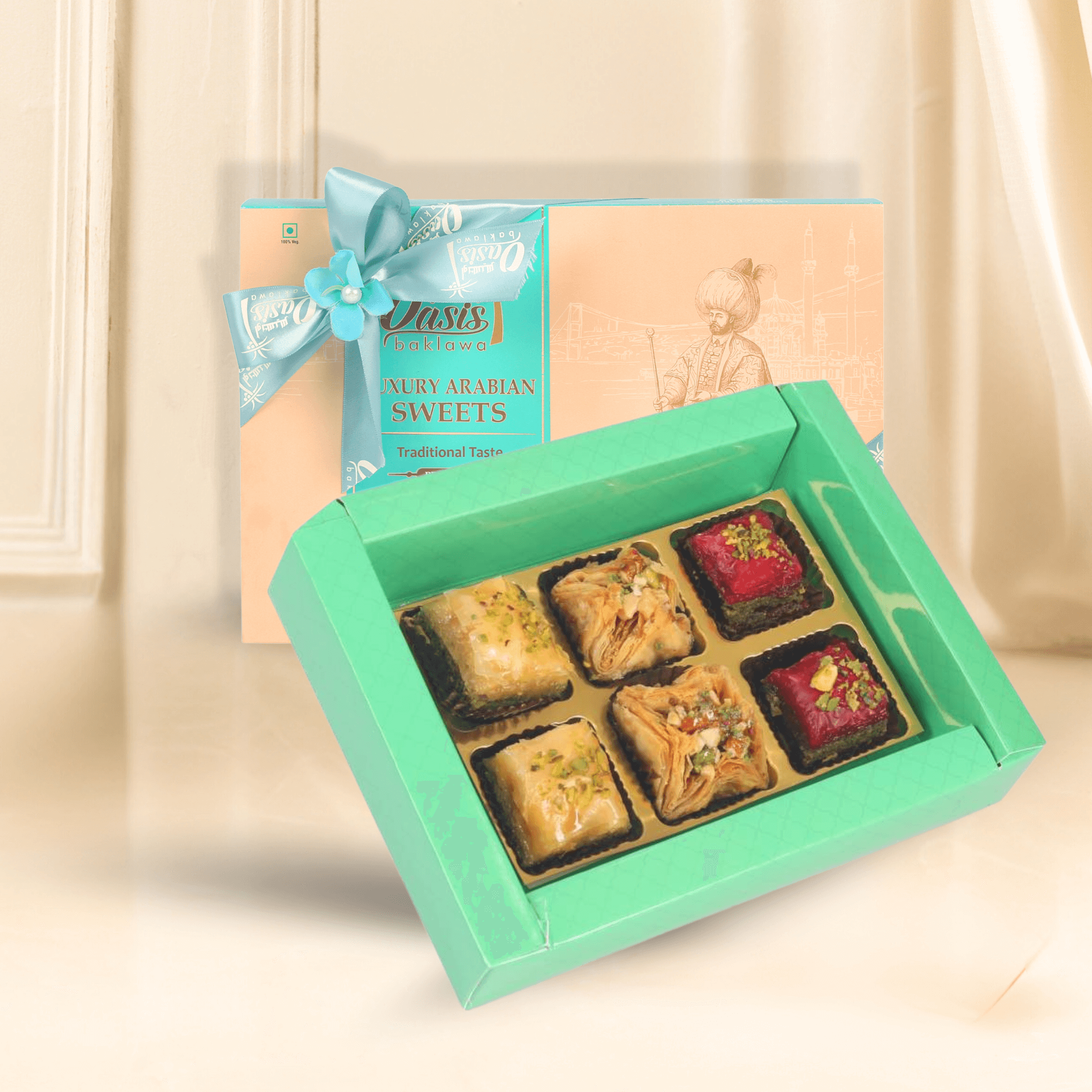 Introducing the Sultan Collection by Oasis Baklawa – a regal range of assorted handcrafted baklawa, inspired by the rich traditions of royal Middle Eastern sweets. Available in elegant boxes of 6, 12, 18, 24, and 30 pieces, this collection features a curated selection of our best-selling nut-filled baklawas made with layers of crisp filo pastry, premium nuts, and lightly aromatic syrup.