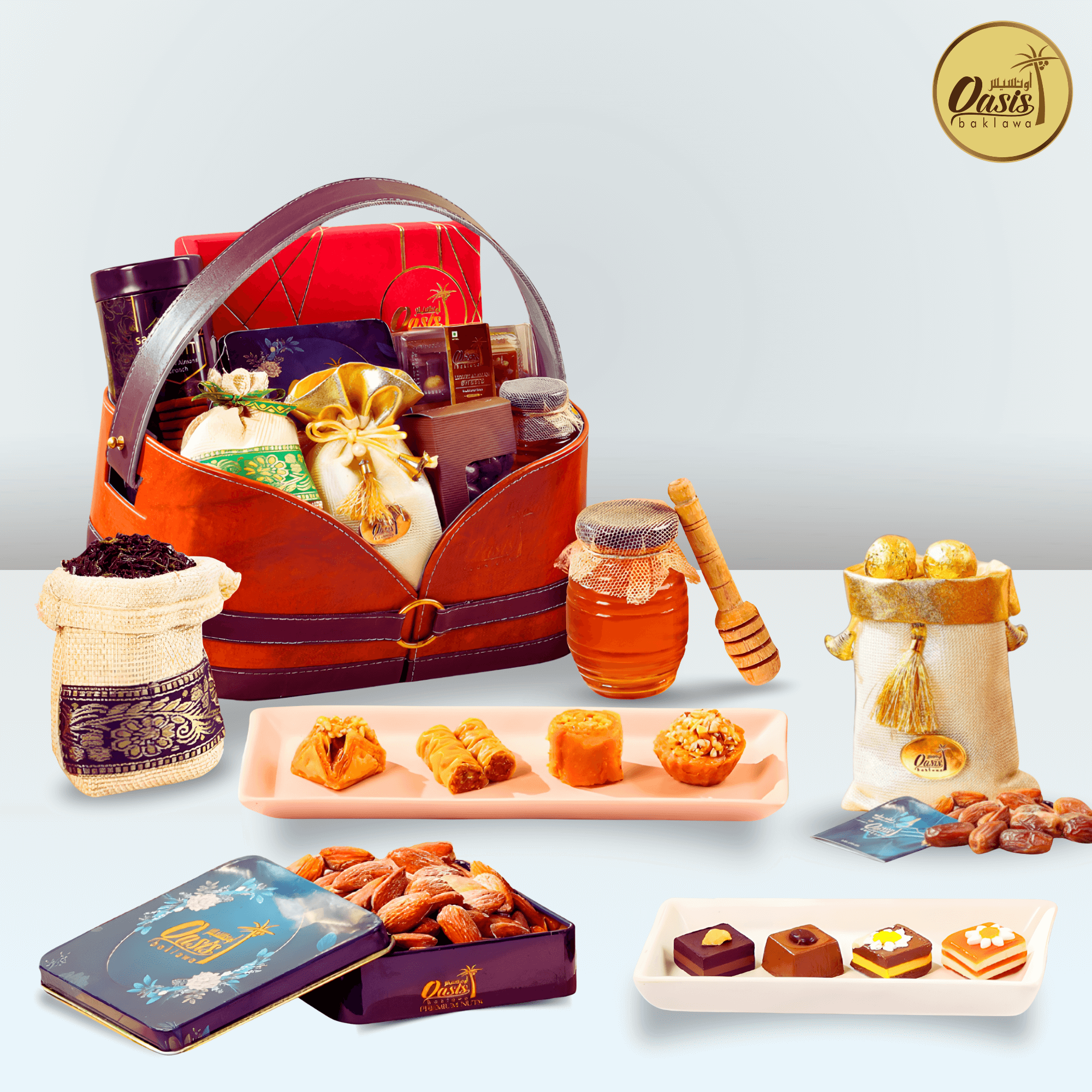 Discover the Tote Allure – an exclusive gift collection featuring premium baklawa, assorted chocolates, almond biscotti, and gourmet honey. The perfect luxury gift for any occasion.