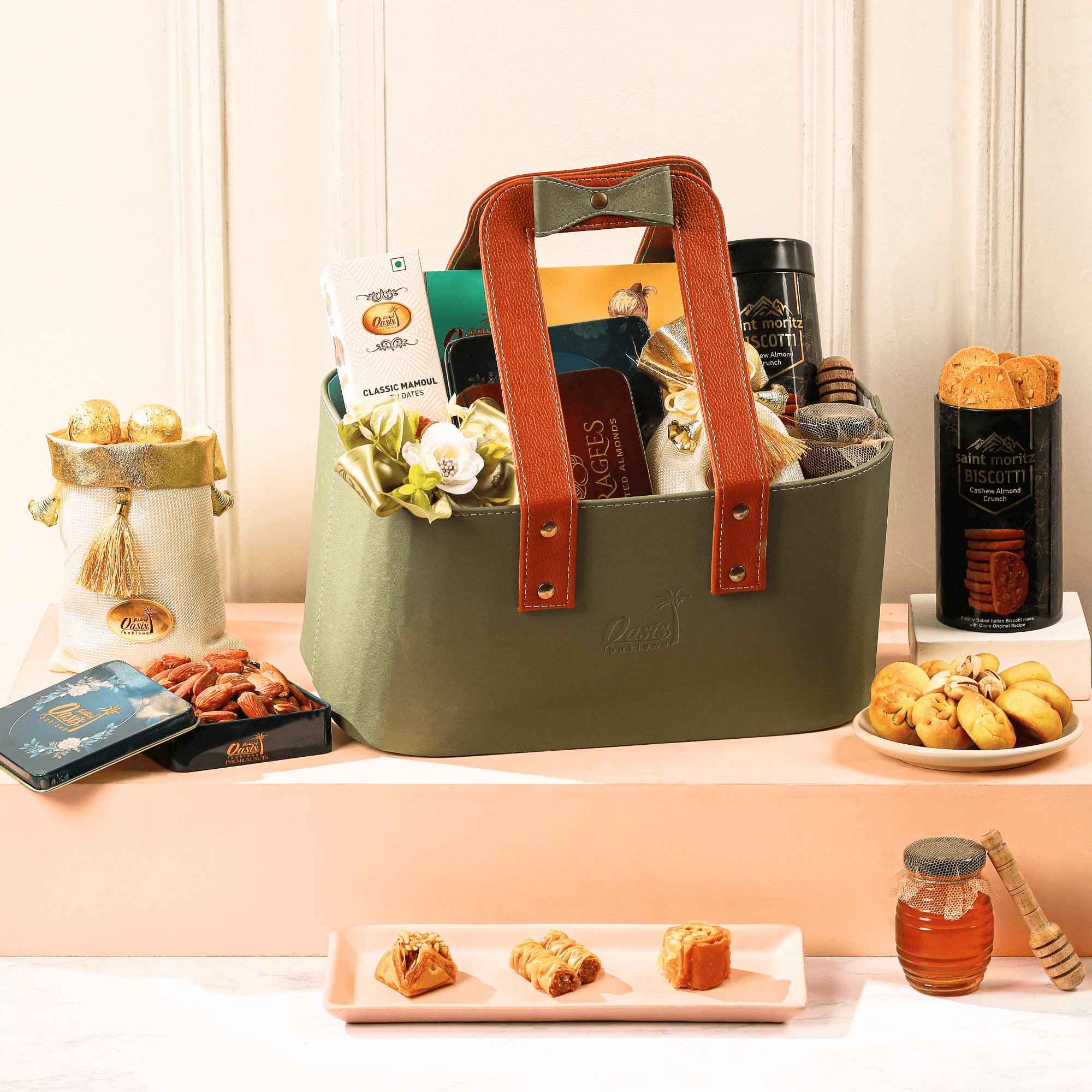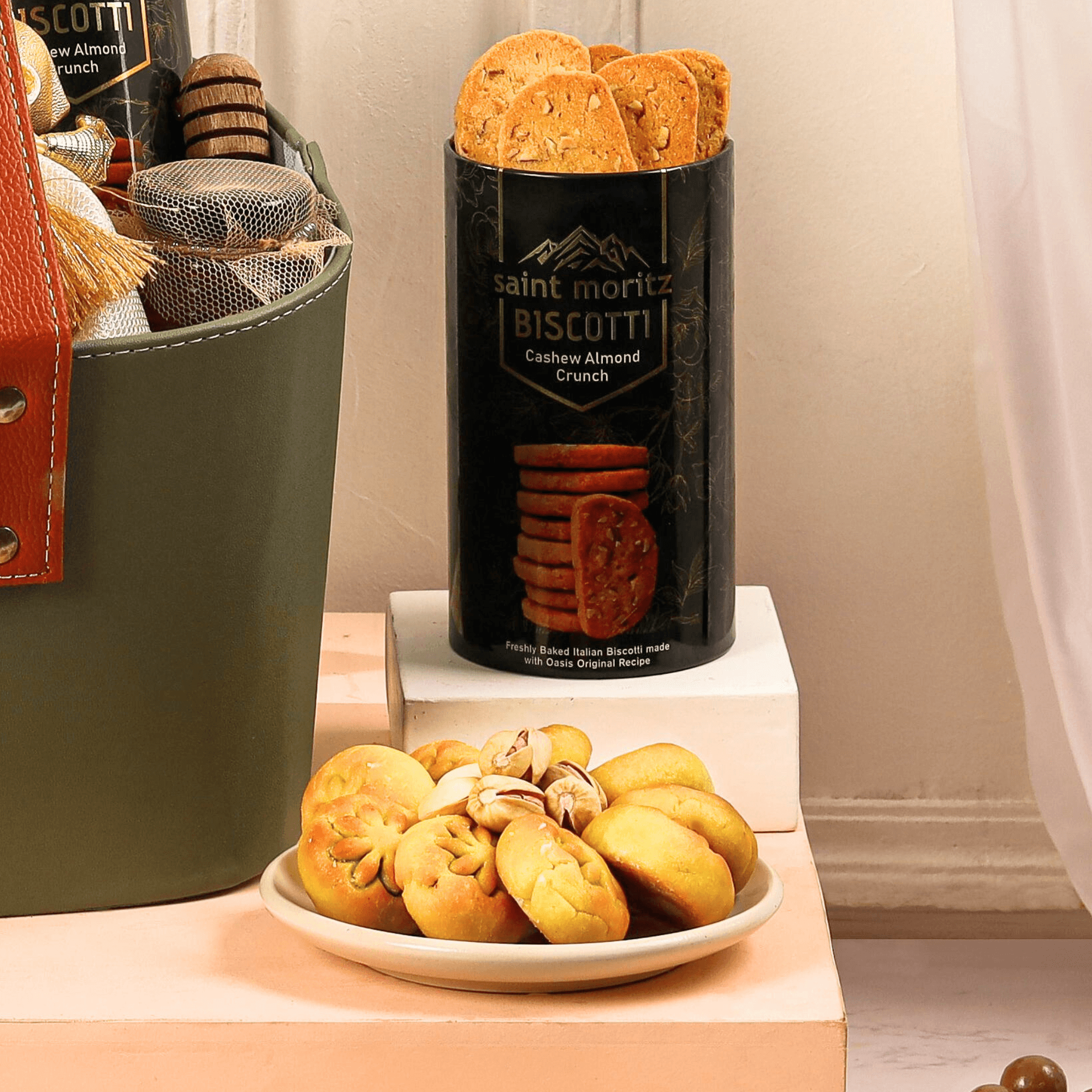 The Tote Treasure Gift Hamper is a thoughtfully packed premium tote, filled with a luxurious mix of biscotti, dragees, exotic baklawa, fusion sweets, and natural honey. Crafted for festive warmth and regal gifting, it offers an indulgent and memorable experience, ideal for Diwali, Rakhi, Holi, weddings, and elegant occasions.