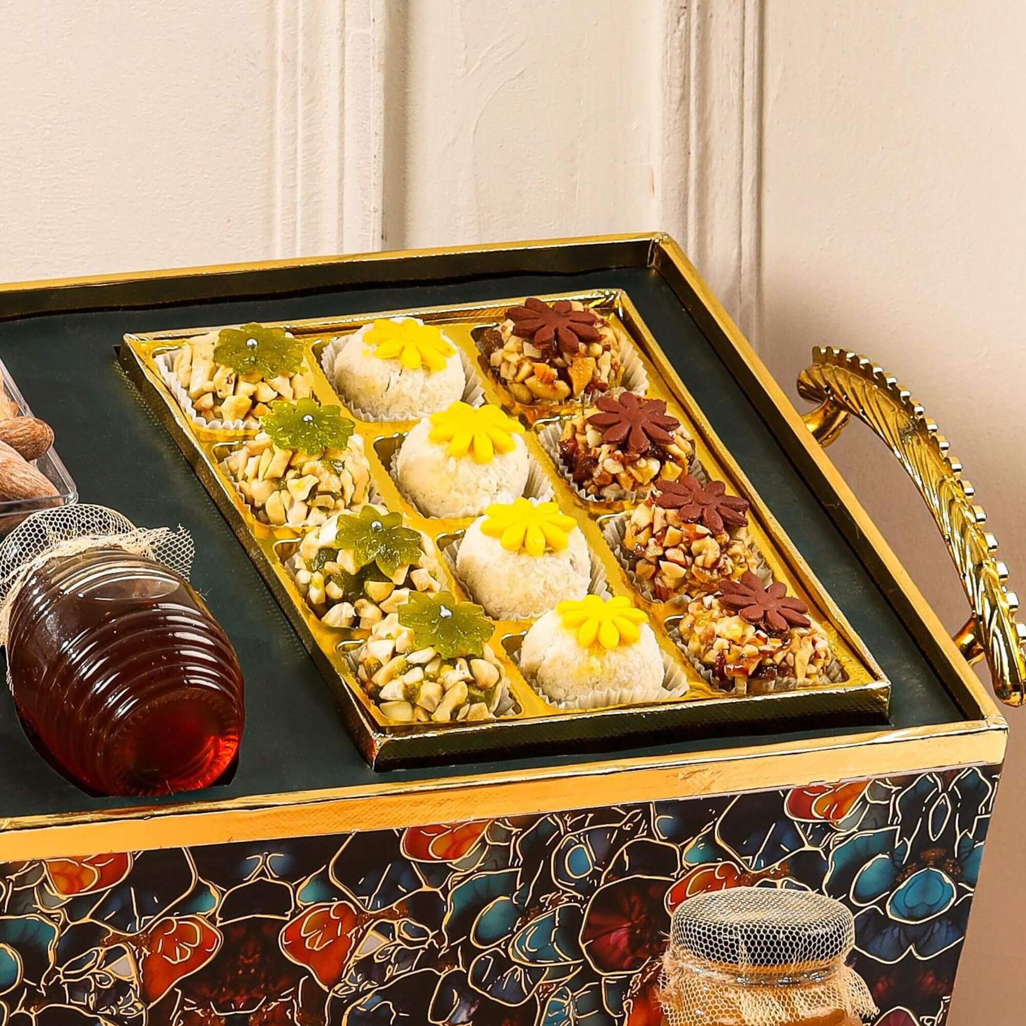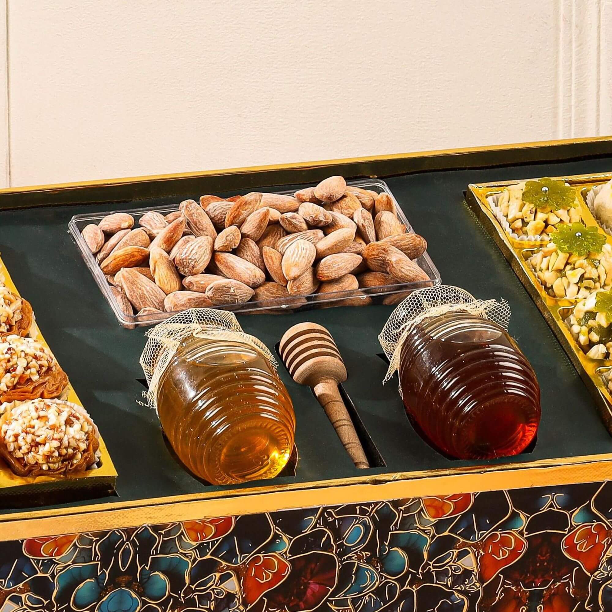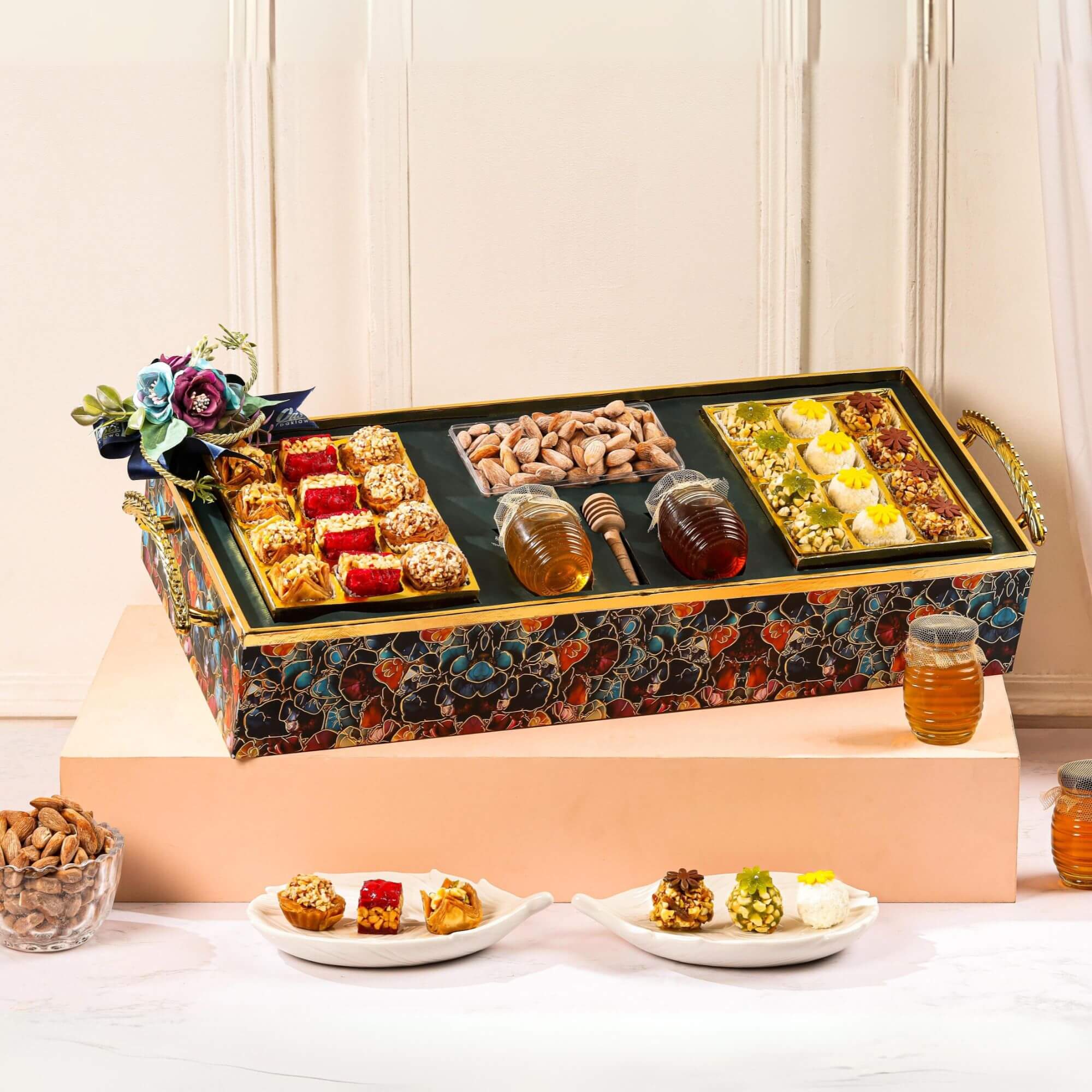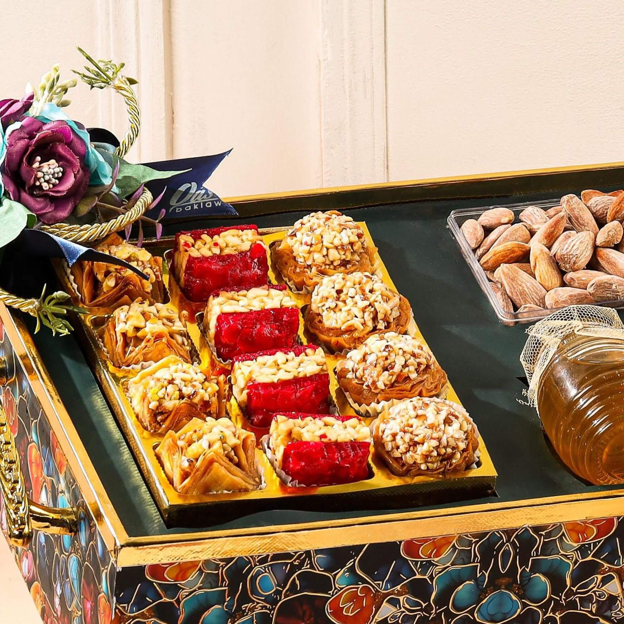 The Zinc Gift Hamper is a rich blend of handcrafted baklawas, Indian-inspired fusion sweets, premium roasted nuts, and exotic artisanal honeys. Designed to impress and delight, it’s perfect for meaningful and luxurious gifting during weddings, Diwali, Rakhi, Holi, and premium corporate celebrations.